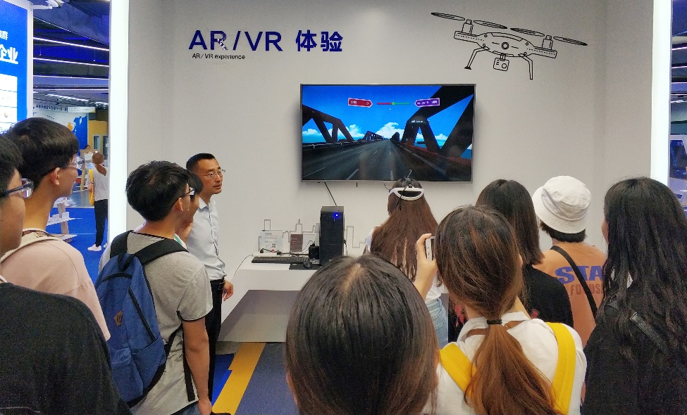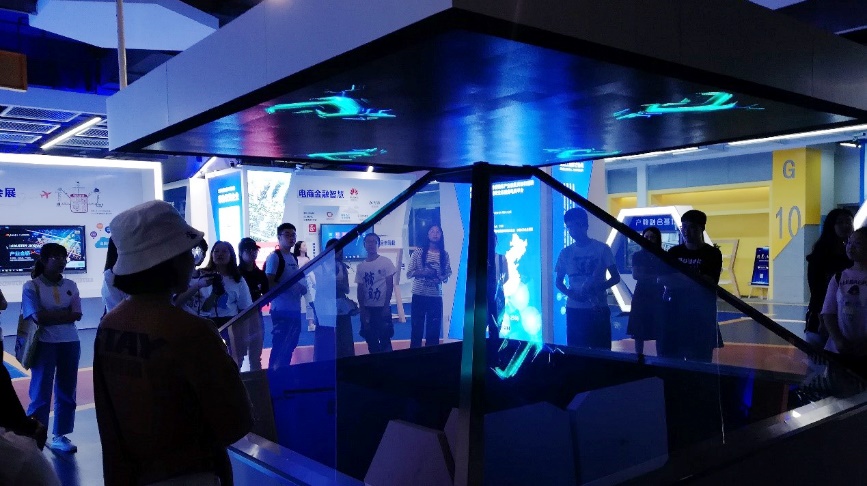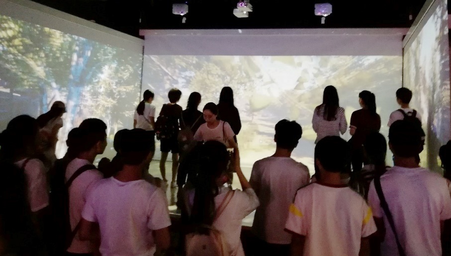在蓝馆中,同学们在工程师的讲解与引导下依次参观并体验了3D打印、全息投影、智能语音、VR全景单车。同学们纷纷登上沉浸式舞台,在欢声笑语中体验步步生花、丛林穿越、海底世界等诸多场景。17级教技二班的周金利感叹道:“如果将虚拟现实和全息投影应用于教学,我们的学习内容会更加生动有趣。”