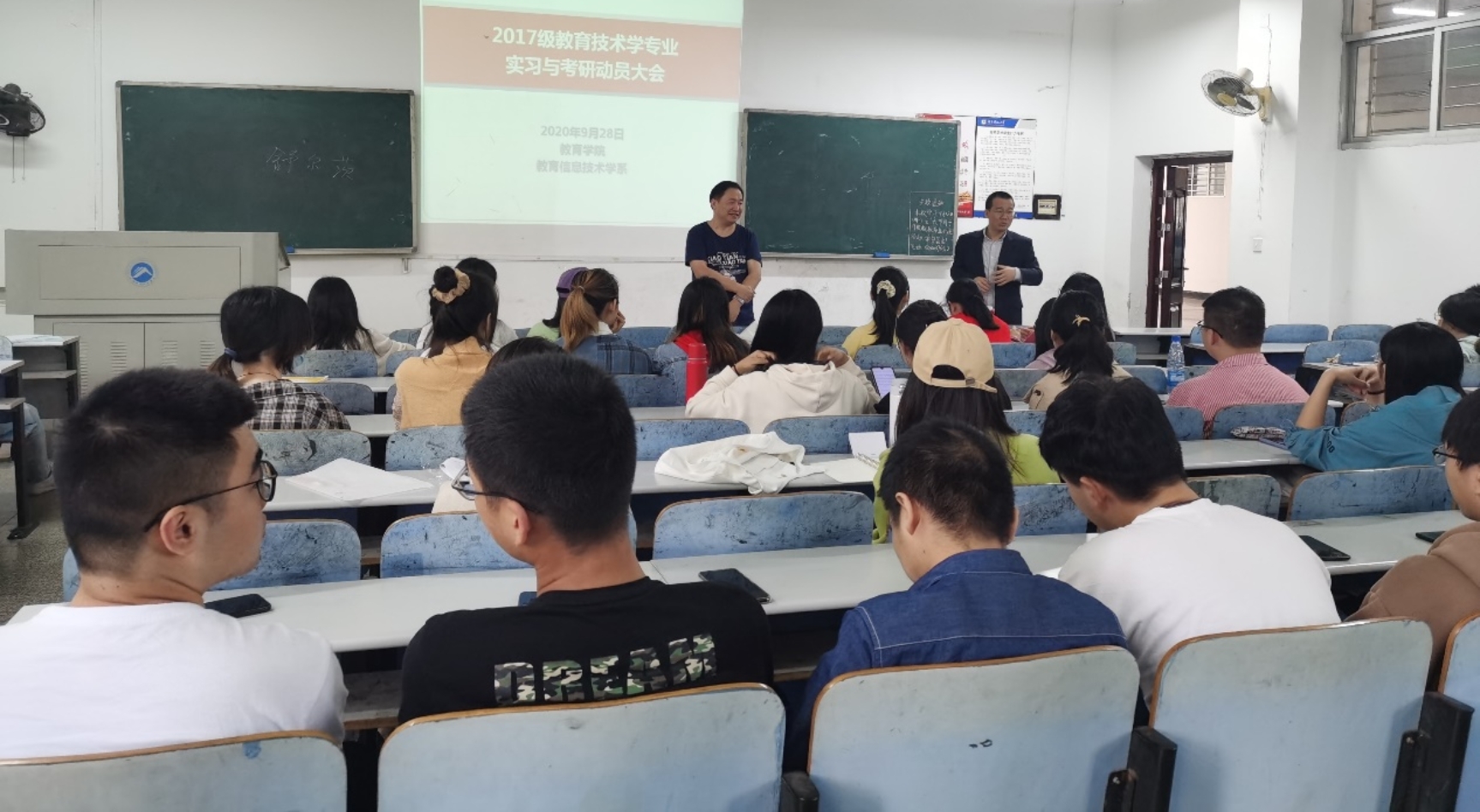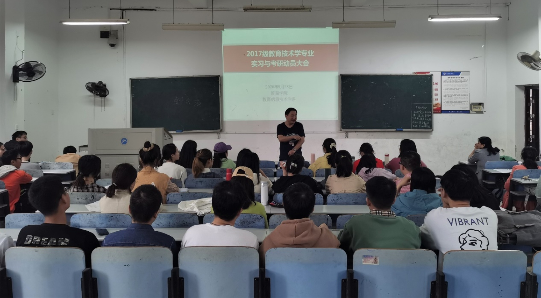为了提高考研率和就业率,教育信息技术学系2017级教育技术学专业本科生实习、考研与就业动员大会于2020年9月28日在八教1-1如期举行。本次会议由教育信息技术学系主任张进良主持,2017级75位同学参加了本次会议,本次会议还邀请了全体实习指导老师及部分教师代表参加。