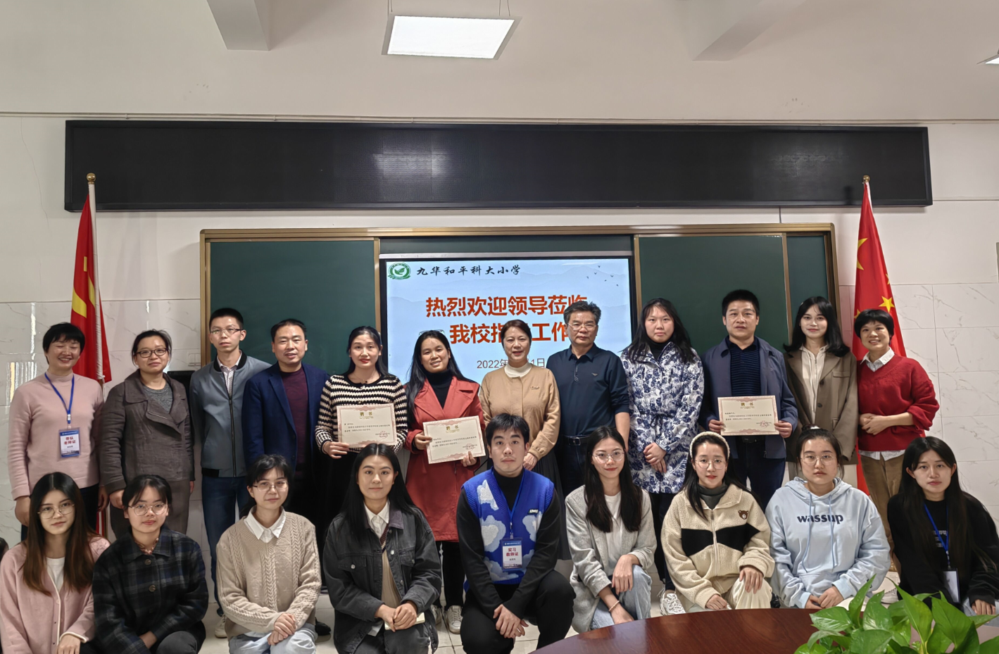 2022年11月1日,公司党委书记李炳煌一行来到九华和平科大小学慰问2019级本科实习生。九华和平科大小学邓亦副董事长主持,小学教育系主任夏永庚博士、副主任陈宣霖博士、夏青博士及教务办陆明丽老师参加活动。