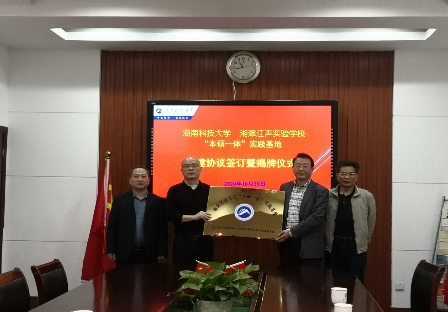 10月29日,球盟会“本硕一体”实践基地共建协议签订暨揭牌仪式在湘潭江声实验公司举行。校教育硕士专业学位公司产品指导委员会副主任委员、球盟会经理李海萍,校教育硕士“培指委”委员、公司党委书记李炳煌,球盟会副经理陈京军,湘潭江声实验公司董事长贺振华,副董事长张频等相关领导出席。