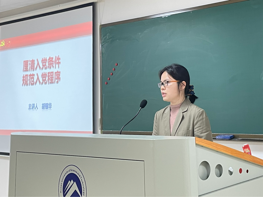 胡银华从“申请入党的条件”“共产党员的基本条件”“共产党员的具体条件”“入党的主要程序”四个方面,围绕党员发展工作的基本要求和程序,系统、详细讲解了发展党员工作的5个阶段和25个步骤,为学员们明确了前进方向与目标,希望同学们积极争取,早日成为光荣的共产党员。