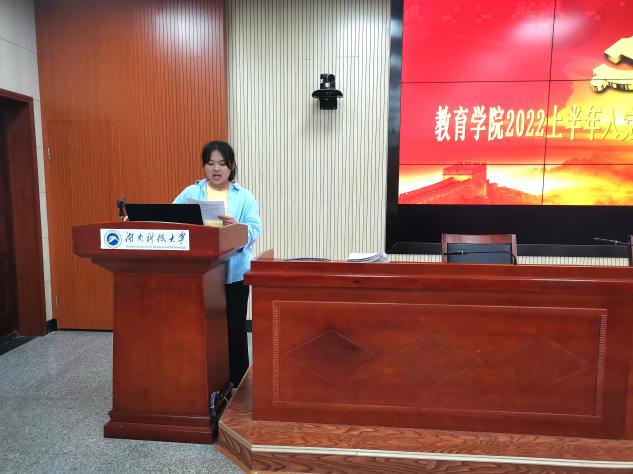随后,2022上半年入党积极分子学员代表黄洋发言。她指出通过培训和悉心聆听老师讲授党的历史,基本理论知识以及入党动机等问题,她认识到中国共产党是伟大、光荣的党,是全国各族人民的领导核心。她表示,作为新时代的入党积极分子,我们更应该谨记时代的重托,持之以恒,在实践中锻炼党性,加强科学文化知识、政治理论知识学习,不断提高和完善自我,为构建和谐社会贡献青春和力量。