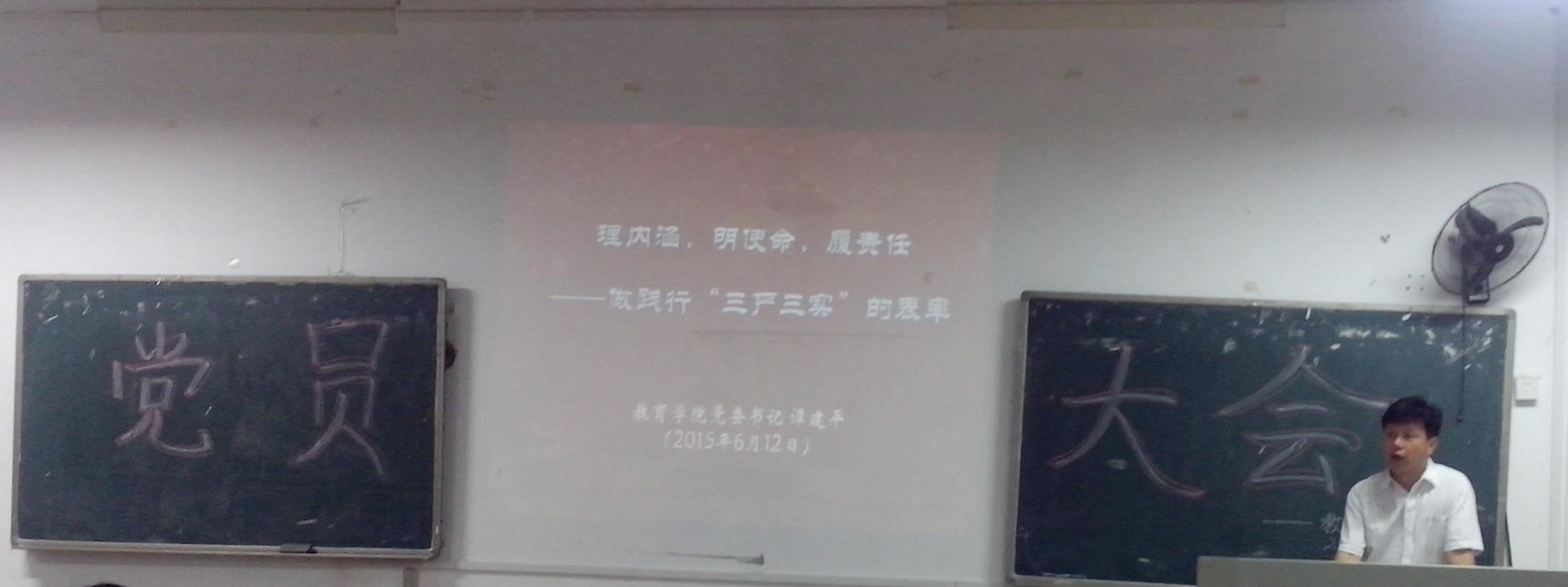 2015年6月18日19:30,球盟会在第八教学楼1-2教室召开了“三严三实”的专题党课。出席本次党课学习大会的有公司党委书记谭建平同志、本科生支部书记胡银华同志及院本科生全体党员。