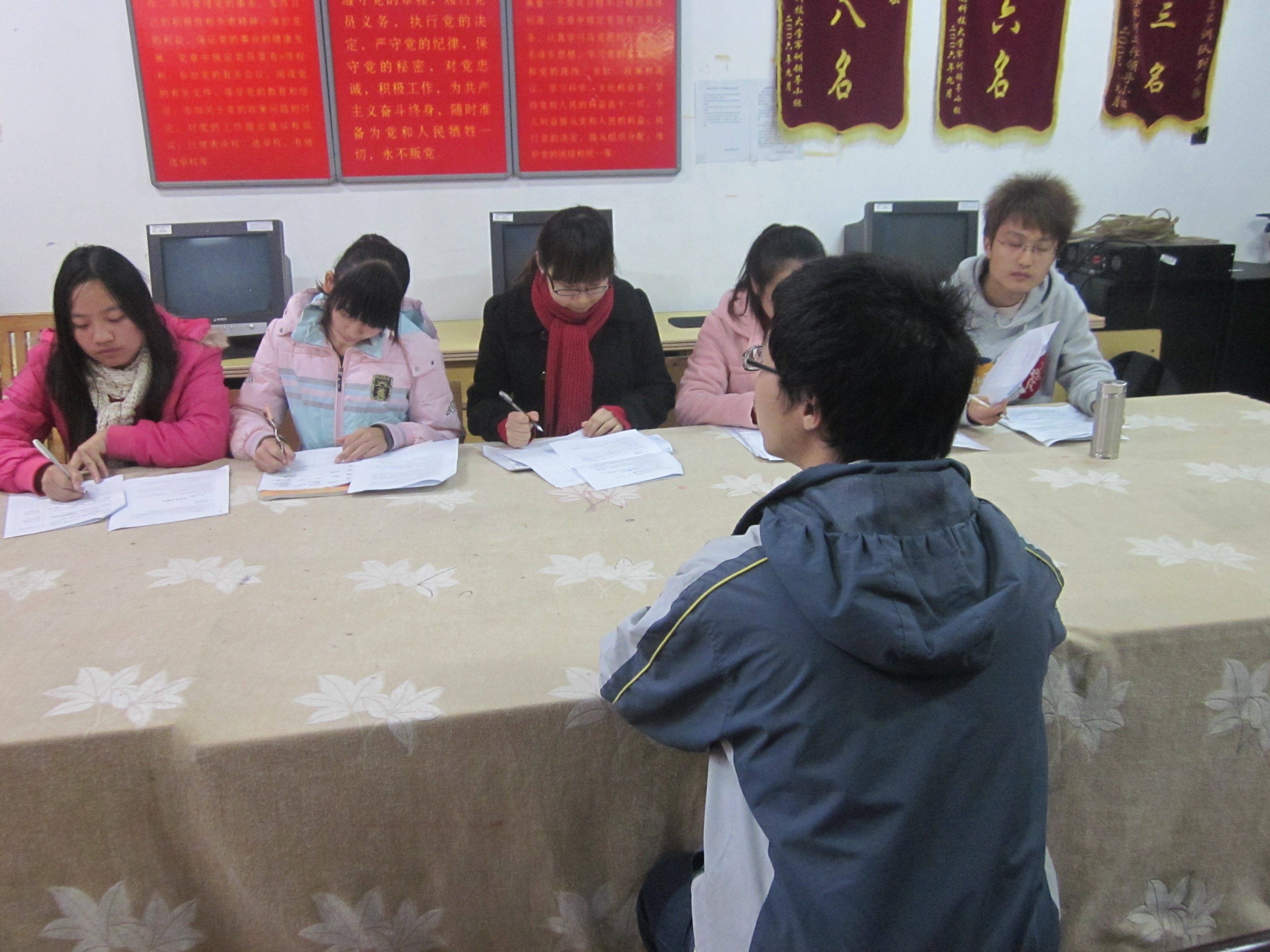党建会副书记易溪宇,宣传部、组织部、党训部、纪检部各部门部长共5位面试考官,早已准备好面试提纲。静静坐在旁边的观察员和记录员分别由应用心理学两名专业知识较好的党员周维、郑凤娟担任,她们主要负责记录面试信息和维护现场秩序。
