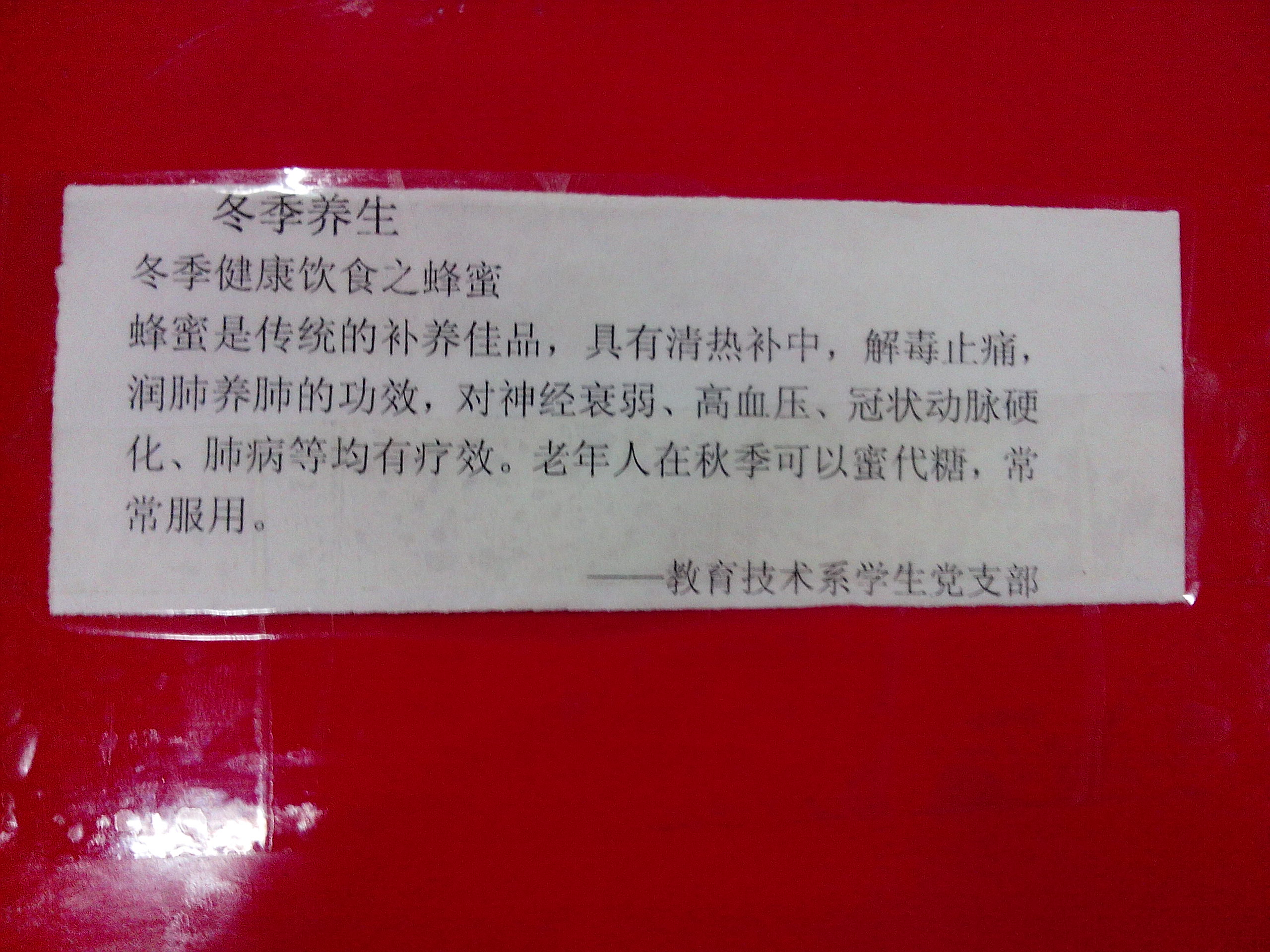 12月12日,球盟会教技员工党支部的同志们开展了一次颇具特色的“食堂贴士”小活动,即在五食堂的餐桌上贴上了冬季饮食和冬季保养小贴士。本次活动时间持续了1小时左右。小贴士内容以冬季食物的搭配为主,让公司师生们在享受美食的同时可以得到更多的营养学和养生学知识,为大家送上了冬日的温暖。