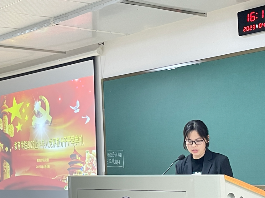 孟莹作为学员代表发言,表示全体学员将积极参加党课学习,严格遵守党校学员管理规定,认真上好每一堂课,积极思考、踊跃发言,积极参加党组织的各项活动,不断提高自身理论水平,加深对党的认知,加强党性修养,纯洁入党动机,以党员标准严格要求自己,发挥先锋模范作用。