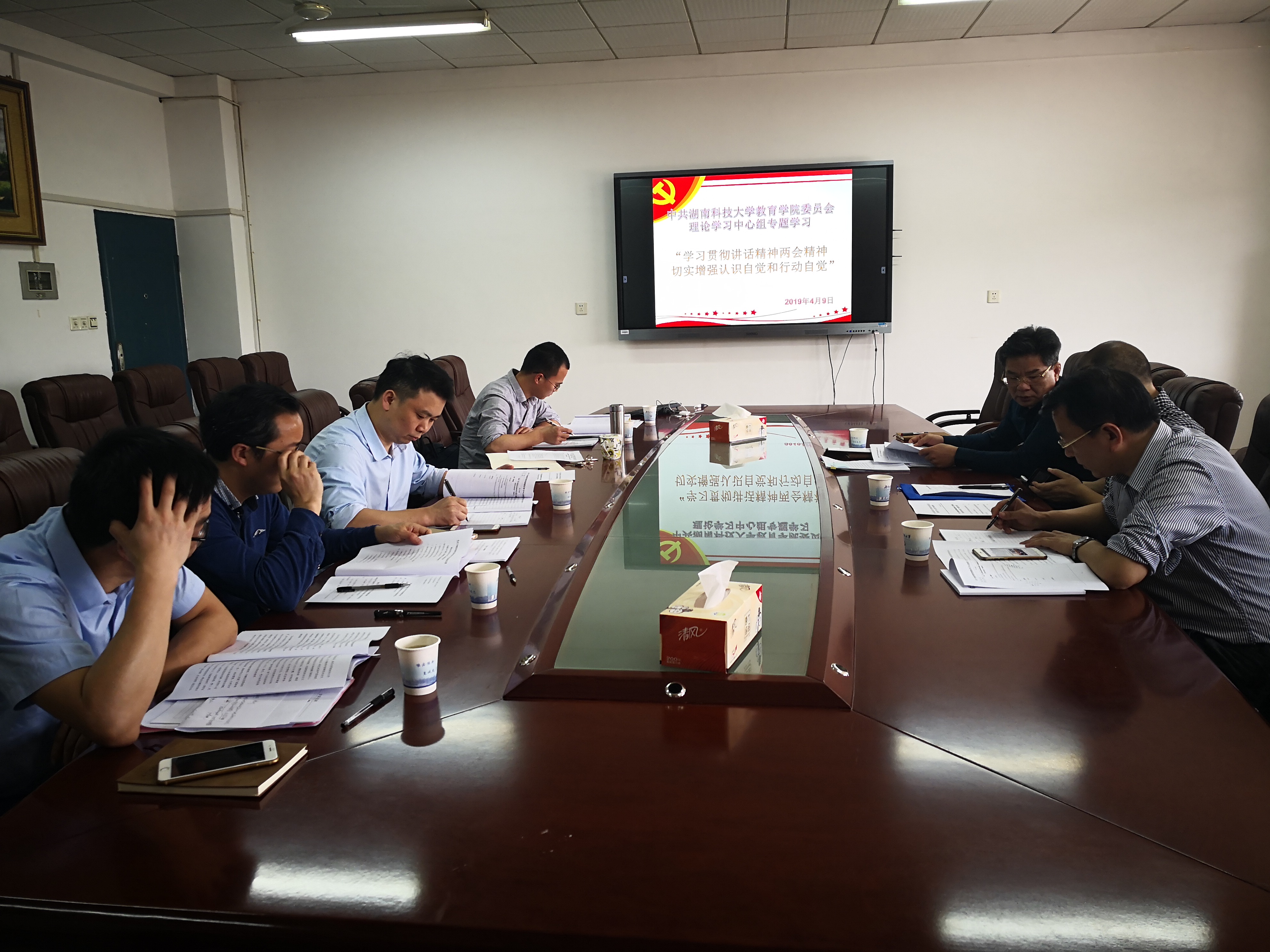 4月9日下午,公司党委理论学习中心组在第八教学楼208室开展“学习贯彻讲话精神两会精神,切实增强认识自觉行动自觉”专题集体学习。公司党委宣传部副部长廖志鹏与会。