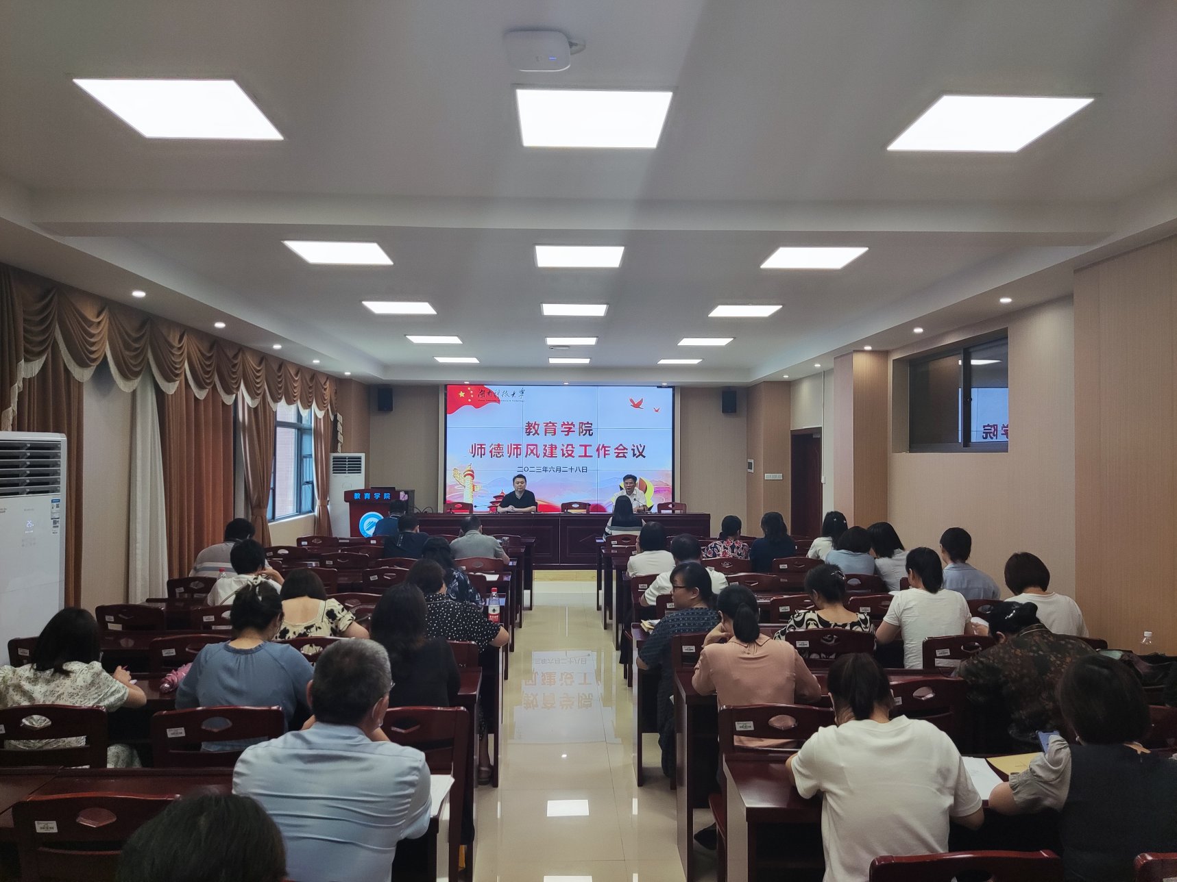 2023年6月28日下午,球盟会在敏行楼A333召开师德师风建设工作会议,全体教职工参加。会议由党委书记李炳煌主持。