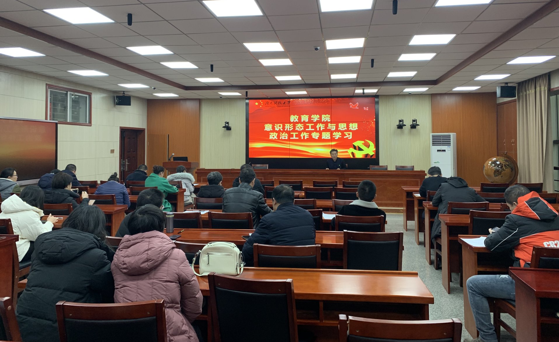 12月31日下午,球盟会在八教308会议室组织全院教职工开展意识形态工作与思想政治工作专题学习。公司党委书记李炳煌主持学习。