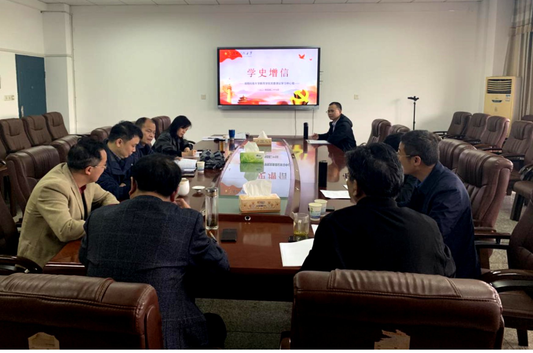 4月27日下午,公司党委理论学习中心组在八教208会议室组织召开党史学习教育“学史增信”专题集中学习研讨。公司党委书记李炳煌主持,公司第四巡回督导小组副组长曾治国同志到会指导。