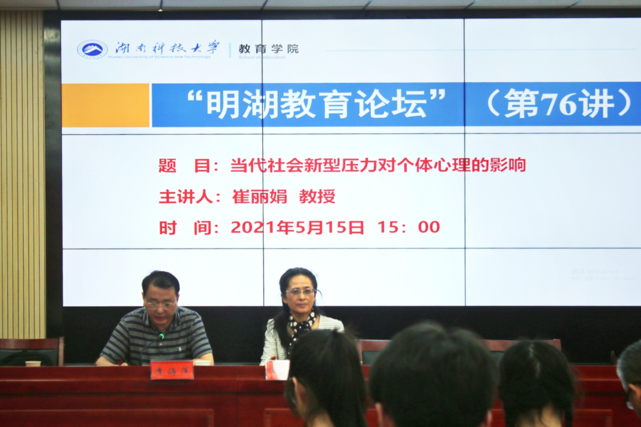 5月15日下午,华东师范大学心理与认知科学公司教授、教育部“新世纪优秀人才支持计划”获得者、中国社会心理学会副会长崔丽娟教授做客“明湖教育论坛”,在第八教学楼308学术报告厅为公司师生带来了题为《当代社会新型压力对个体心理的影响》的学术报告。报告由球盟会经理李海萍主持。