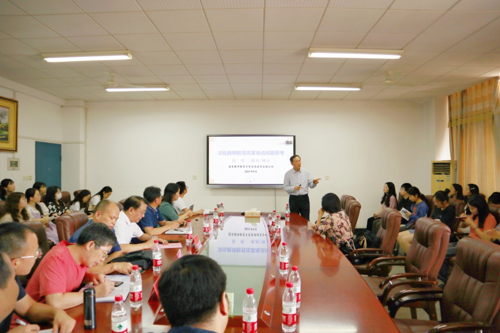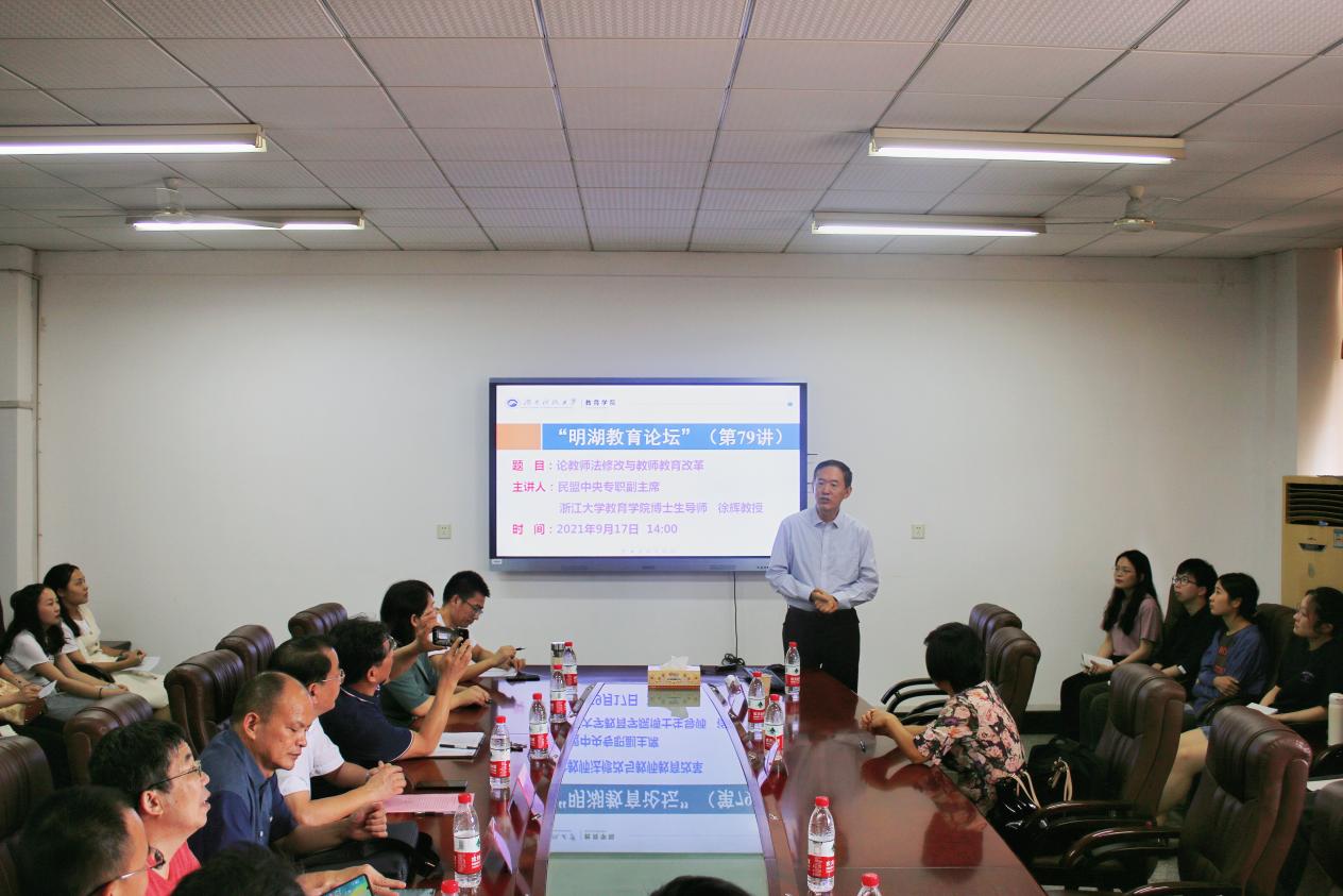 9月17日下午,民盟中央专职副主席、浙江大学球盟会博士生导师徐辉教授做客“明湖教育论坛”,在第八教学楼208会议室为公司师生带来了题为《论教师法修改与教师教育改革》的学术讲座。报告由球盟会经理李海萍主持,公司领导、教师代表、研究生代表到场聆听。