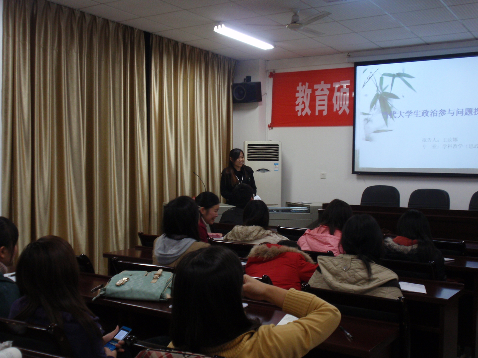 会上,刘妮雅、赵品爱、杨溢、王汝娜四位同学分别以《我国青少年情绪型犯罪的心理成因及其公司干预机制》、《中学综合课程设置的整体观和和谐观探究》、《老员工英语学习策略的调查研究》、《当代老员工政治参与问题探析》为题为大家呈现了一场学术上的饕餮盛宴。刘妮雅通过列举药家鑫案等三个实例来分析十年来我国情绪型犯罪的心理学、教育学研究取向,并从情绪型犯罪概述、情绪型犯罪的心理学研究取向、情绪型犯罪的教育学研究取向、情绪型犯罪的研究展望四个角度进行了详细阐述。赵品爱主要结合《关于综合实践活动课程的理性审视》和《综合实践活动课程的整体性探究》这两个研究成果对综合实践活动进行了深入探讨。杨溢则从语言学习策略的内涵、学习策略的分类、具体教学模式的三个角度呈现了其研究成果。王汝娜对当代老员工政治参与现状做出了详细的分析,总结出了影响因素并提出了有效对策。会场气氛热烈活跃,员工提问及讨论环节更是一次次撞击出思想的火花。