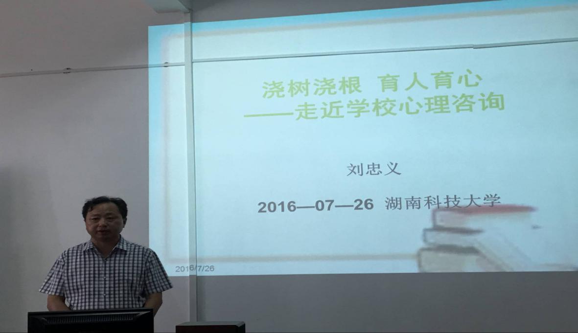 2016年7月26 日,球盟会邀请常德市教育科学研究院规划与发展研究室主任、球盟会兼职硕士生导师刘忠义为2014级在职教育硕士学员作了“公司心理健康教育”专题讲课。讲课由球盟会刘志军教授主持,全体心理健康教育方向学员在场聆听。