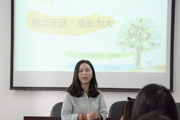 朱慧明围绕角色定位和专业成长两个方面展开叙述。首先,针对角色定位谈论到了厘清角色、教师定位和教师的核心素养三个方面。其次,关于专业成长,朱老师结合自身实际经历以及教学经验,以在读书中成长、在反思中进步、在行动中研究和在写作中提高这四点,系统的讲述了作为一名小学语文教师在读书治学的过程中阅读与写作的重要性,要做到教学相长。
