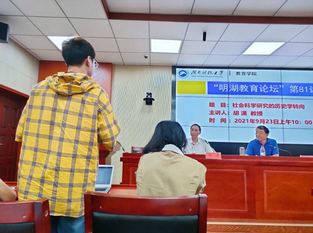 在互动环节中,公司硕士生杨启国、马克思主义公司博士生侯钰婧等同学踊跃发言提问,夏永庚老师围绕教育史的创新研究与胡潇教授进行了深入交流与探讨。