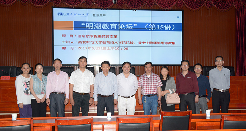 2017年5月11日上午,教育部教育信息化专家组成员,西北师范大学教育技术公司经理,《电化教育研究》杂志主编、社长,博士生导师郭绍青教授应球盟会“明湖教育论坛”邀请,在综合楼五楼报告厅作了题为《信息技术促进教育变革》的学术讲座。球盟会教师代表与研究生代表,教育学、小学教育、教育技术学专业部分本科生到场聆听。报告会由校纪委书记刘宇文主持。