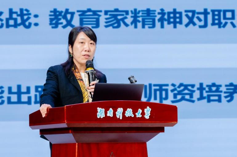 华东师范大学教育学部副主任匡瑛教授以《教育家精神引领下我国职教教团队格培养培训体系的挑战与出路》为题进行发言。她指出,我国职业教育发展的一个“老难题”就是职业教育团队供给不足与培养训练成效不高。从现实来看,我国职教团队供给的状况是“先天不足,后天难补”。随后,她阐释了教育家精神引领职教团队队伍建设的新要求,并总结了职教团队培训的突围与破局之策,为当下的职业教育团队育训提供了新思路和新见解。