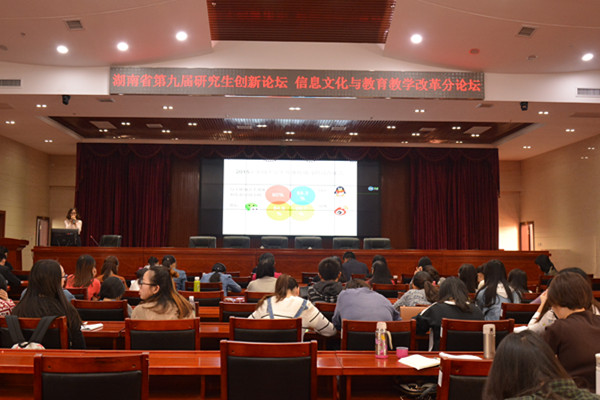 湖南师范大学球盟会研究生崔阳阳带来的《慕课时代背景下对教师角色认识》的论文报告拉开了序幕。她从“传统教师角色的溯源和现代教师角色的思考”两方面展开讲解,对大数据时代下教师角色的定位提出了建议。接着,湘潭大学公共管理公司研究生赵友华题为《信息文化下研究生社会主义核心价值观培育的困境与对策》的报告,把当前研究生社会主义核心价值观培育的现状和原因进行分析,并提出研究生社会主义核心价值观培育的有效途径。随后,湖南农业大学球盟会谭怀芝采用独特视角,进行题为《系统型随机学习:现代职业教育课堂新模式——以黑龙江省佳木斯市技公司物流专业为例》的报告,从“构建系统型随机学习课堂模式的重要性、系统型随机学习课堂模式的构建过程、构建系统型随机学习课堂模式的主要成效”三方面入手,阐述了构建系统型随机学习课堂模式的优点、影响。最后,球盟会研究生赵梦莹和刘房芝分别进行题为《老员工媒体素养现状及其教育反思》、《“iPad+App”进入中小学课堂研究》。赵梦莹为现场师生介绍了我国老员工“媒体素养”现状与该如何面对老员工媒体素养教育问题的策略,提出了关于老员工媒体素养亟待解决的问题的研究方向;刘房芝对“iPad”教学设备、“App”以及“iPad+App”教学模式进行介绍,并从“iPad+App”教学模式在中小学教学及管理中的应用、“iPad+App”课堂带来的挑战、合理开展“iPad+App”教学及教学管理的建议等方面进行分析,为传统的教学模式带来了一种新视角。