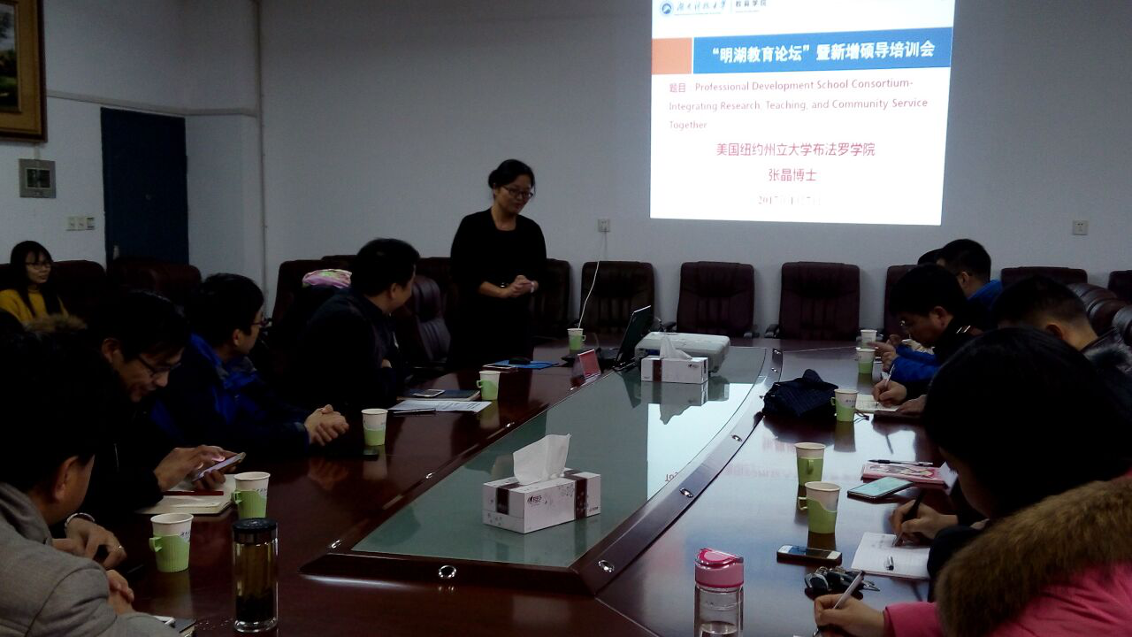 2017年1月7日下午,球盟会“明湖教育论坛”暨新增硕导培训会在八教203室举行,美国纽约州立大学布法罗公司张晶博士作了一场以《专业发展公司联盟:研究、教学和社区服务的整合(Professional Development School Consortium- Integrating Research, Teaching, and Community Service Together)”》 为主题的讲座。公司党委书记谭建平、新增硕士生导师、部分教师代表和研究生到场聆听了此次讲座。讲座由球盟会谭千保主持。