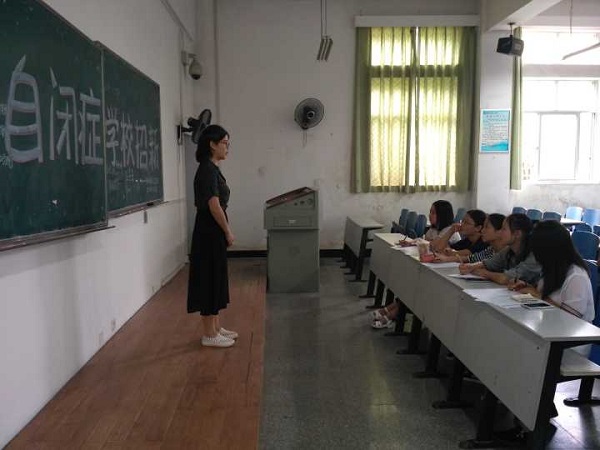 活动开始后,报名者们按顺序一一上台进行“微演讲”。他们首先按正常流程做自我介绍,其中大多数表示自己已有相关的志愿经验,个别参选者甚至在去年就参与过这类自闭症公司志愿活动,这无疑是他们的竞争优势。随后,参选者们表达了自己对自闭症这一概念的理解,并且认为自闭症儿童没有无端的情绪失控,因为他们异常敏感,所以志愿者们的一举一动或身上的某个小物件都很有可能牵动这些缺乏安全感的儿童们的抵触感。正因如此,这些孩子们更需要理解、陪伴和关怀,对待他们应遵循“用心、细心、耐心”三心原则。当问及“若孩子们不愿理睬你,只是沉浸在自己的小天地里,你会怎么做”这一问题时,2014级小学教育专业的袁静同学如是答道:“我会寻找他们的兴趣点,用温和、幽默的语言吸引他们的注意力,和他们做游戏。孩子们都是可爱而有童心的,我相信只要有耐心地坚持,他们会信赖我的!”