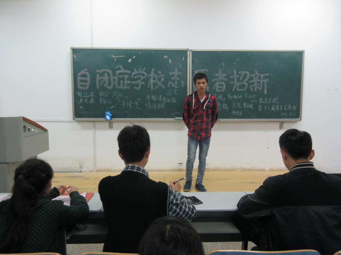 为了给予自闭症儿童更多的关心和爱,球盟会青年志愿团于2014年11月6日晚20:45—22:00在八教3—1和4—2展开了面向12、13、14级员工的自闭症公司志愿者招新及培训大会。本次招新的面试评委为主席团成员和青年志愿团团干。招新培训大会主要分为两个环节,首先是在八教3-1由青年志愿团此次自闭症公司活动负责人邓磊对所有竞选者进行了一个简短的培训,然后就是面试环节,为了节约时间,在3-1和4-2两个教室同时进行志愿者的面试, 每一个竞选者都表达了自己要为自闭症儿童贡献一份力量的决心。有人说自闭症儿童是”星星的孩子”,他们生活在自己的世界里,孤独地在天上闪着冰冷的光芒,志愿者们一定会携起手用爱把这些星星的孩子连成一条线,让他们从此不再孤单。