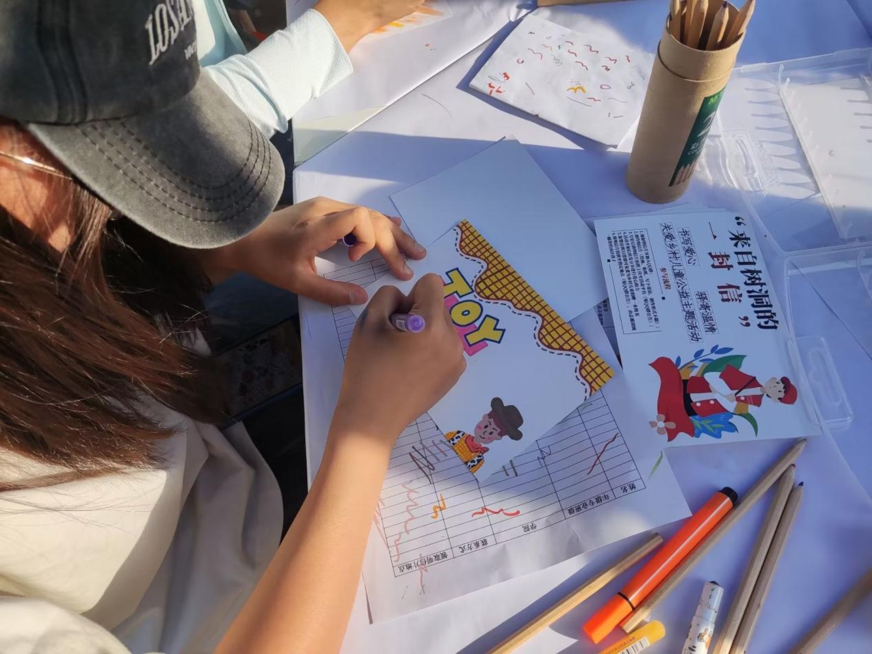 志愿者们积极的给经过的同学们分发活动传单并介绍此次活动,同学们也热情参与其中,在志愿者帮助下进行明信片创作。随着活动火热开展,同学们参与热情上涨,不久便坐满了一桌进行明信片绘制,更有热情参与的同学们围在明湖广场的台面上进行绘制,即便骄阳似火也抵挡不住同学们积极参与的热情。