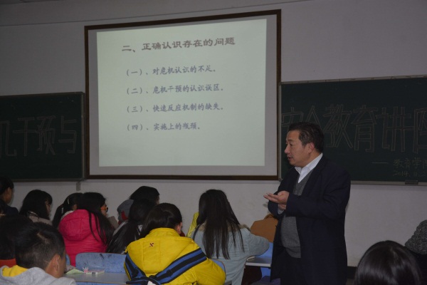 讲座一开始,王书记以一个邪教的宣传电话带入主题,点明了校园安全的紧迫性并同时感谢了公司危机干预部的成立为公司大大降低了危机事件的发生。紧接着王书记从六个方面介绍了危机干预的基本知识,分别是“我们生活在危机之中”、“正确认识存在的问题”、“基本概念的解读”、“危机的基本特征分析”、“危机的基本类别分析”、“新型危机干预机制”。并提出老员工身边的各种危机及应对对策,从实例出发,为同学们进行讲解,让同学们受益匪浅。详细的讲述使同学们全面地掌握了安全知识,提高了自我防范意识。
