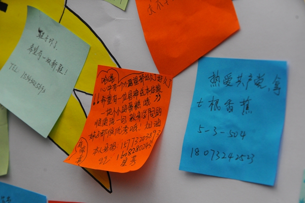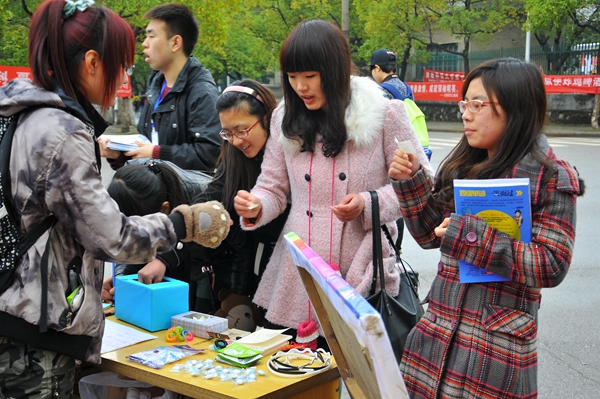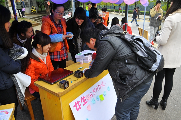 由公司第十五届团委员工会精心制作的视频在课堂间隔的10分钟播放,男生们真诚的寄语,李涛老师幽默风趣的“星星”祝福语,员工会成员真心的表演,都轻轻地走进了大家的心坎里。在采访中,来自13级应心2班的谭敏同学说:“最后那个熊猫和QQ宠物的对话最有趣了!真的感受到了那中暖暖的感觉。”目光投向电信路口,没错,那就是球盟会团委女生活动部精心策划实施的“女生,我想对你说”、“女生心愿男生帮”等活动也在倾情进行。粉色蓝色的气球装饰着少女的心,不仅有男生自愿抽取3月6日晚下寝收来的愿望卡去实现幸运女神的愿望,还有很多人激动地参与有奖竞猜。令人惊讶的是电视台的主持人和记者来采访了这次活动的经过。我们看到的比这雨天的水更多的是员工们的幸福笑容。晚上还有“星使”下寝送贺卡,给教育女神们睡前的感动。