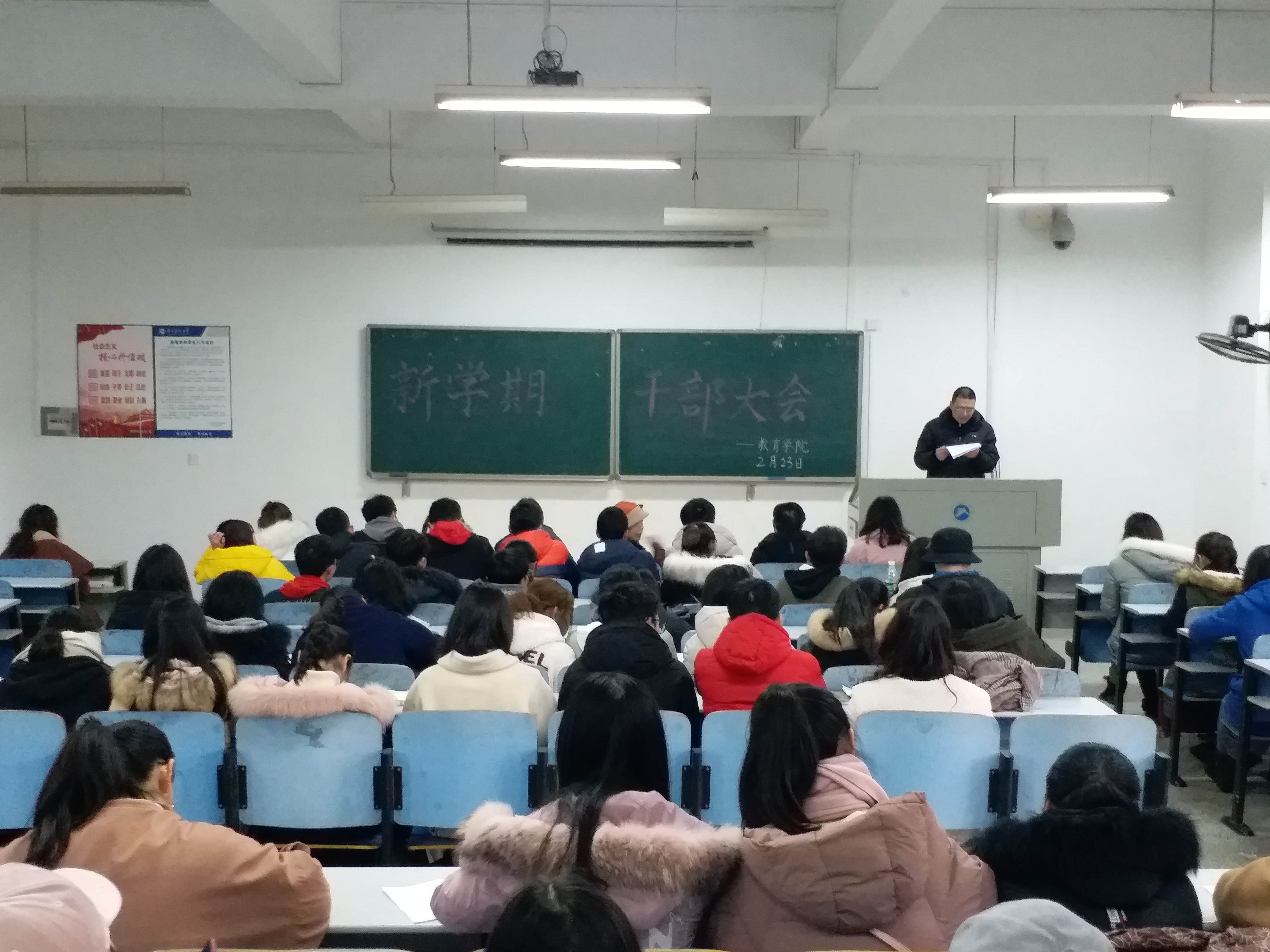 2019年2月23日下午5点,球盟会于八教3-6举行新学期干部大会,党委副书记刘辉亚、学工办老师李涛、尹琼芳、练素华等出席会议,15-18级员工干部参与会议。