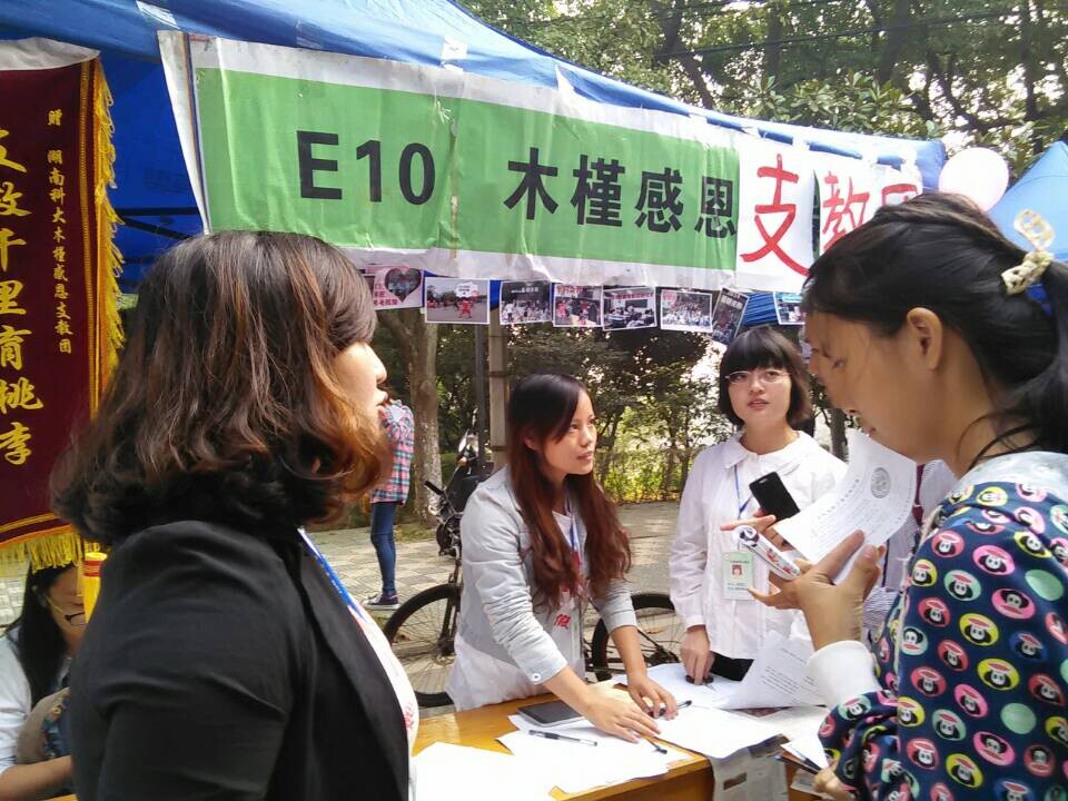 木槿感恩支教团社长冉晓玲介绍到:前来报名的同学只要登记信息并缴纳社费就成为木槿感恩支教团的一员。收取社费是木槿今年招新的一项重大变化,这项改革将有利于社团活动开展,减轻社团外联部的压力,让更多的人力投入的支教活动中去,使木槿的发展更上一个高度。在招新点,工作人员耐心的向前来咨询的员工介绍了社团的支教活动安排和社团活动成果,解答他们的疑惑。