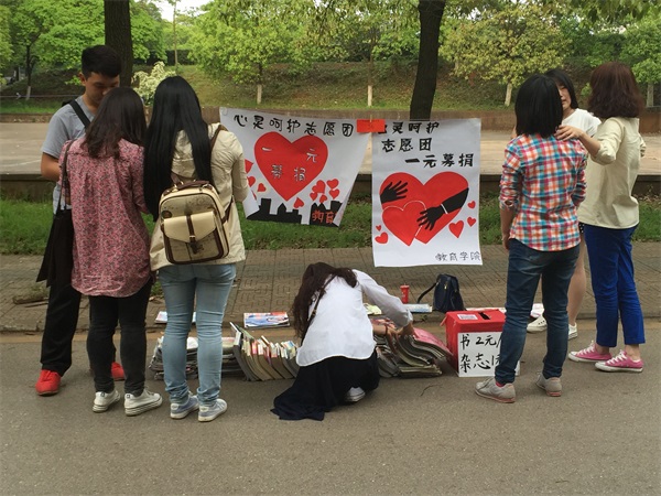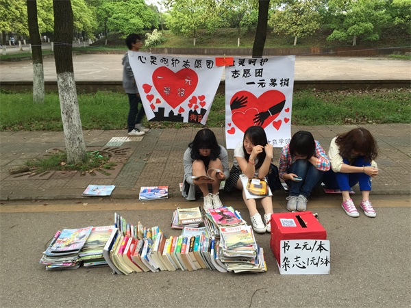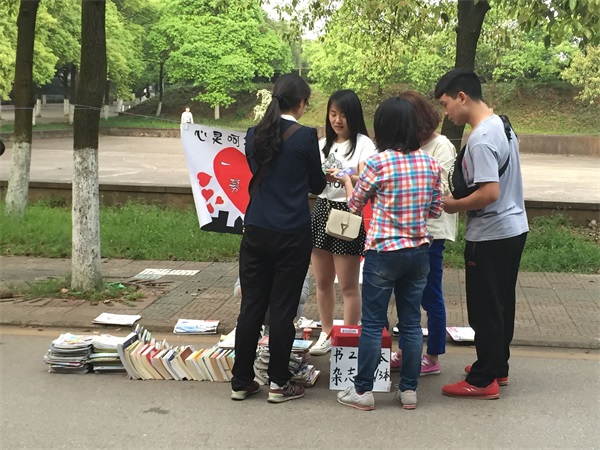 14:00-16:00,两天里志愿团组织部安排工作人员轮流负责现场。图书依据种类进行定价,杂志一元三本,教育、文学等书籍两元一本。低价且丰富的图书引来不少同学的目光,截止至26日18:00所得金额已有100多元。“我觉得在这些摊位里,和在校生、校内外商家、个体经营户比起来,虽然他们体现出自我创业和敢于尝试的品质,但是你们不太一样,你们是在’收买爱心’啊。”一位前来买书的热心同学激动地说道。