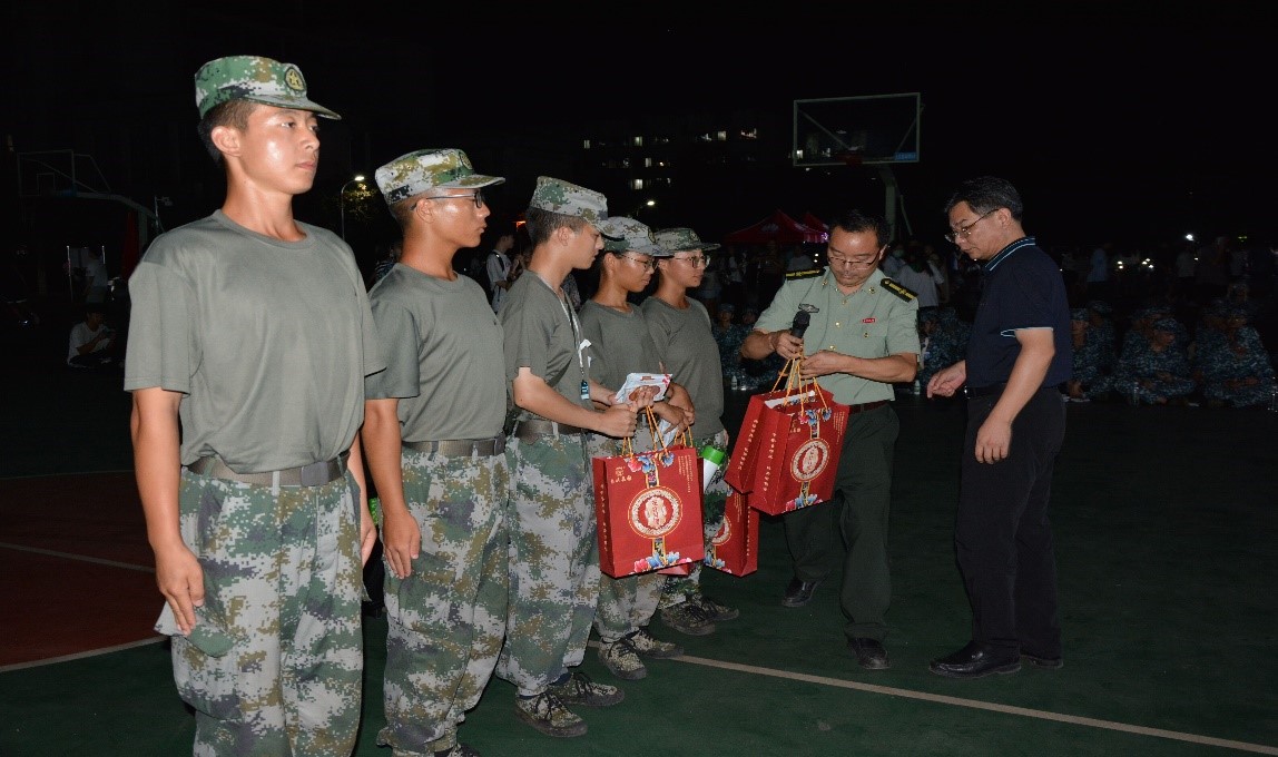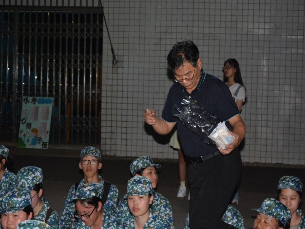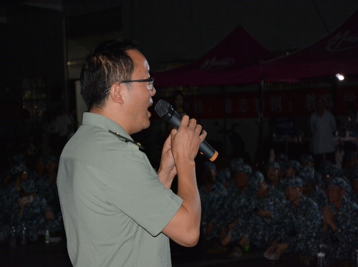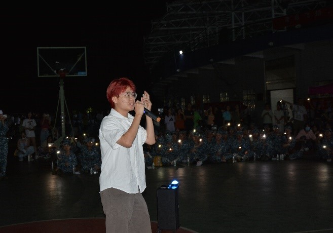 晚会以2021级应用心理学三班的刁英超的独唱歌曲《我还年轻我还年轻》开场。轻快摇滚的曲风氛围感满满,将同学们立刻点燃。歌曲过后,李炳煌问到:“大家想家了吗?”“想。”“吃点月饼就好了”。随后李炳煌、刘辉亚及员工干部们给全体新生发放月饼,以表节日祝福。“掌声不够热烈啊”…在一阵阵掌声中,刘辉亚代表公司给教官们分发中秋月饼礼盒。刘辉亚谈及军训,问道”军训累不累?“同学们表示累但可以坚持。又恰逢中秋,希望同学们可以给爸爸妈妈打个电话,送上节日祝福。其次,希望同学们可以迅速融入球盟会这个大集体,在日后的学习生活中取得好成绩。