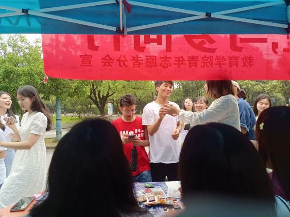 一部分志愿者分散在广场周边,耐心地同路过人群宣传活动,另一部分志愿者则温柔细心地向摊位前同学介绍活动环节,引导大家参与活动。