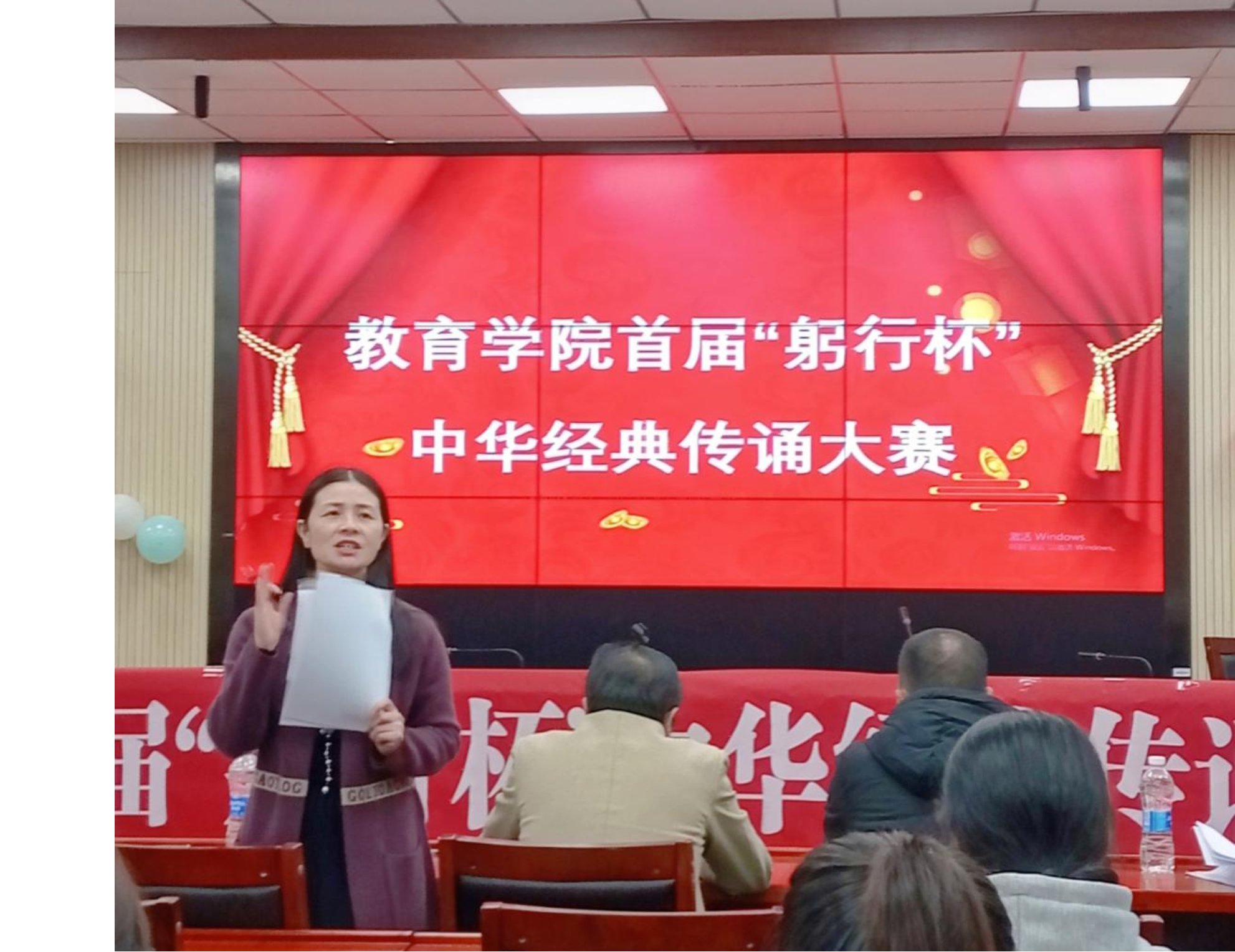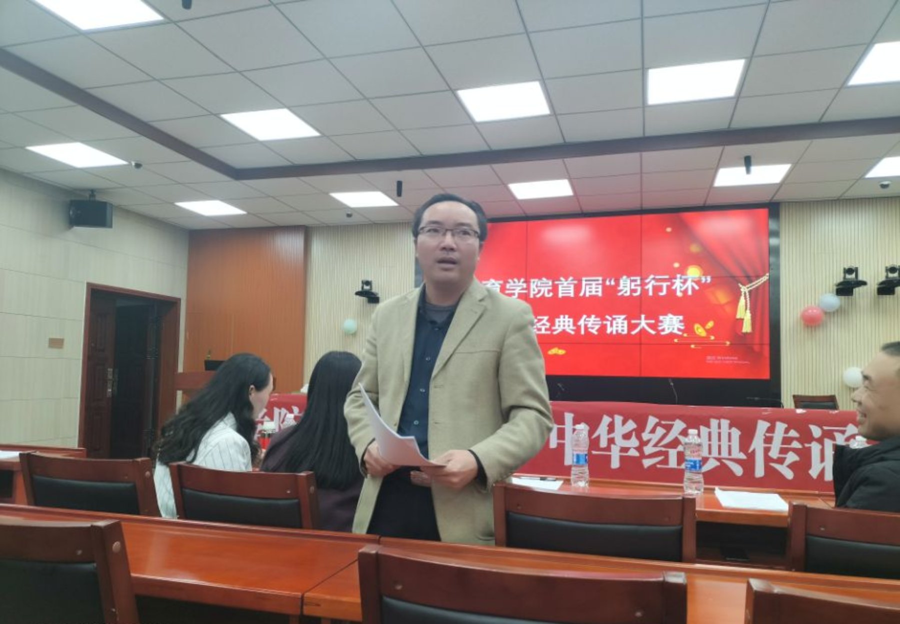 为进一步丰富校园文化生活,营造浓厚的书香校园氛围,弘扬中华优秀文化,激发员工的读书和诵读经典热情,更好地促进公司员工人文素养培养,球盟会举行了首届“躬行杯”中华经典传诵大赛。本次大赛由小学教育系和院团委联合举办,由黄青老师担任总指导,由科技活动部进行策划组织,经过初赛选拔,共有13个小组入围决赛环节。决赛于10月22日晚在第八教学楼308室进行,公司刘辉亚副书记、小教系夏永庚主任、冯青来老师、黄青老师以及特别邀请的教务处夏莉副处长出席担任评委。