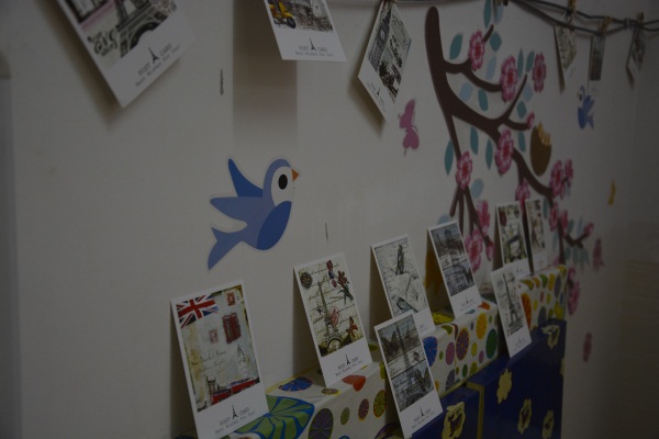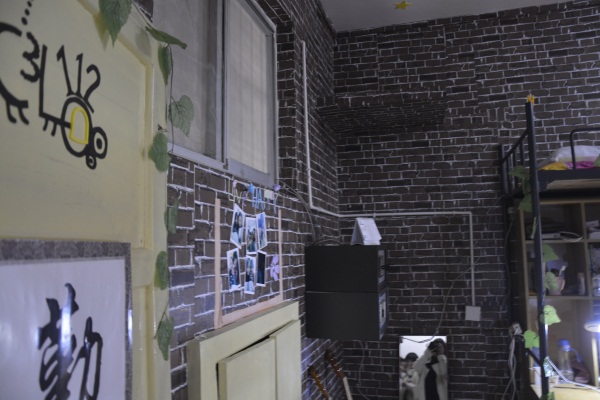 显然,同学们都对自己的宿舍进行过精心设计,素雅的墙纸,漂亮的床帘,精致的小饰品将宿舍装扮的简洁大方、清新典雅,弥漫着书香气息;还有的宿舍贴上了寝室成员大合照、心愿、祝福,再配上宿舍温馨的装扮,给人带来家的温暖。除此之外,精美的室徽,严谨的寝室公约也是此次寝室文化节的一大亮点。贴纸,彩帘,气球等饰物令人仿若置身晚会现场,而别具一格的留言板,卫生角,记忆墙等细节也让人眼前一亮,更有女生用心折出来的千纸鹤,纸星星点缀其间,尽显准备之精心。其中涌现出许多不俗之作,譬如女生宿舍112匠心独运地用酷似墙砖的壁纸营造出浓浓的复古风情,配合恰到好处的几种乐器,自成一家,获得了滕老师及团委员工会干部的一致好评。而男生宿舍411则另辟蹊径,在一片贴纸的海洋中举起了剪纸的大旗,自信地向滕老师及各干部介绍着纯手工制作的,以大型钢琴剪纸为主体的一系列繁复的剪纸作品。其真诚给人留下了深刻的印象。同学们的设计作品百花争妍,各有千秋。尽显院学子卓越的设计才华和过人的艺术素养,着实令滕老师惊叹不已。