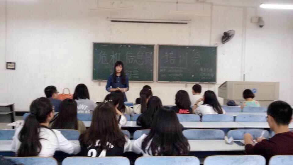 2015年10月20日球盟会危机干预部在八教3-6组织召开了15级新生危机信息员培训大会,本次会议的主要目的是:为了危机干预工作的有序开展,提高新一届危机信息员的危机意识,培养其在细节处发现危机信息的能力。出席本次会议的有:球盟会心理辅导员老师练素华,团委员工会副主席兼危机干预部部长肖雨薇同学,以及危机干预部的全体成员。会议由危机干预部部长主持召开。