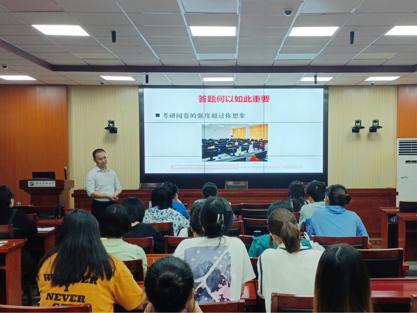 讲座伊始,张晓报对今年考研形势进行了细致的分析,同时祝贺在研究生考试中成功过线的同学。他讲到,考研初试与复试有很多的共性问题,过线的同学依然要重视复试环节,在精神上和行动上都不能懈怠。他从“为什么要重视考研复试”、“考研复试有哪些内容”、“考研复试要准备什么”、“考研复试笔试(考研初试)如何拿高分”、“考研复试面试如何脱颖而出”这五方面进行讲解,鼓励同学们抱着积极进取、平和自信的心态准备复试,争取取得优异的成绩,进入理想院校。