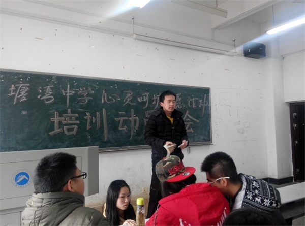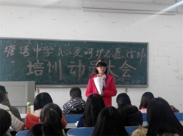 大会伊始,上届志愿团团长唐敏对活动内容做了简要陈述,其中除了团训、房树人分析、心理访谈及文艺汇演等志愿团常规内容外,还会进行志愿者们前期募捐所得书籍的捐赠仪式。她对志愿者提出要求,团训要力求创新,数据分析细致多思,访谈中积极主动。她还强调,为使活动更有利于孩子们的健康发展,要从细节发现问题,及时给予他们帮助以及做好后期的跟踪呵护,并且在发现重点呵护对象的过程中更要细致认真,做好必要的家访工作。