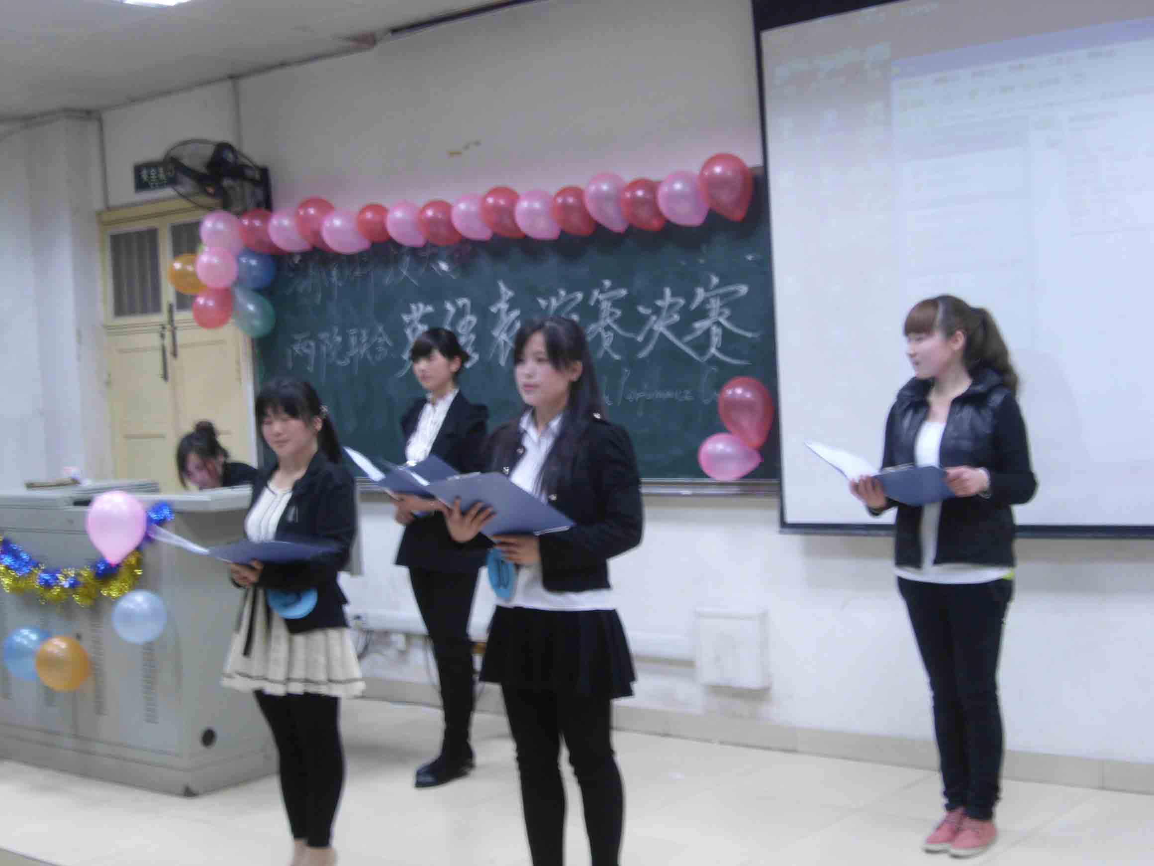 3月29日晚七点,球盟会和生命科学公司联合主办的英语表演赛决赛在十教附一102举行,由生命科学公司柳媛慧、任月方老师、球盟会李爱华、何辉英老师担任此次英语表演赛的评委。