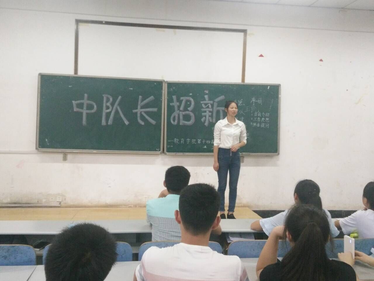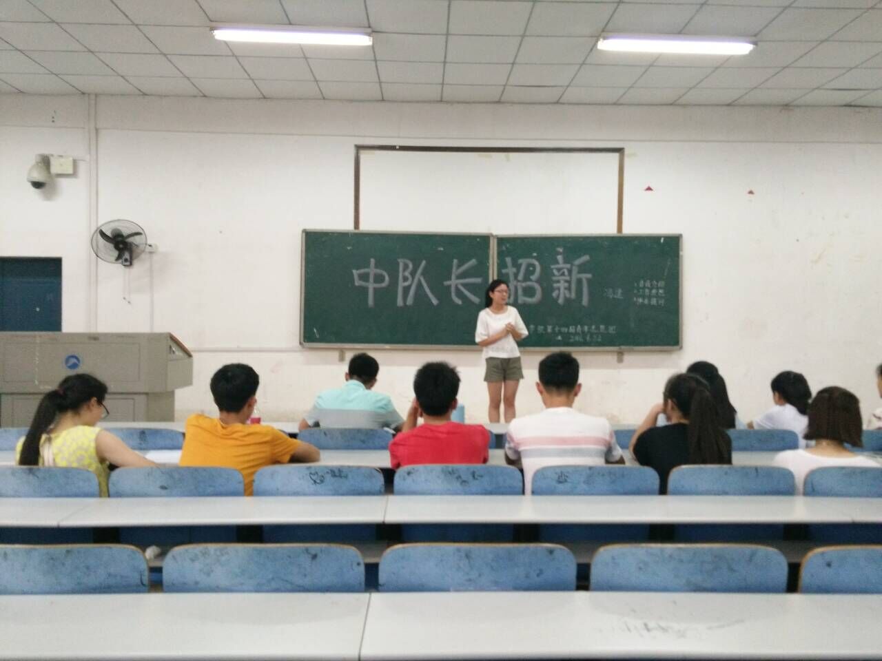 2016年6月22日12:30,志愿团中队长换届竞选在第八教学楼1―3举行。出席现场的人员有主席团负责人范乐佳,德育实践部部长李菊,副部长黄馨慧、钟秋萍和郑巧玲,以及各个竞选人员。