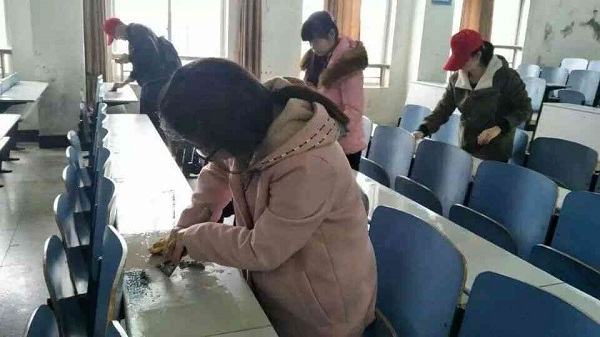 天气很冷,太阳一直不肯放晴,风拂过脸庞的瞬间留下的只有凉感。志愿者们齐心协力,分工合作,一些人提着铁桶,拿着抹布和清洁剂穿梭在一行行蓝色桌椅间,他们用力地擦着桌椅上留下的黑色笔印;一些人拿着扫把和铲子,低头认真地清理着桌子里、地板上的果皮纸屑,有些垃圾又脏又臭,有些笔印留下的时间也很长了,这都需要耗费很大的力气,可是他们毫无怨言,只是低头默默地干自己的活。铁桶里的水放过一段时间后格外的冷,志愿者们的手一个个被冻得通红,他们也只是面带微笑的把手放在嘴边哈气,又接着干自己手中的活。