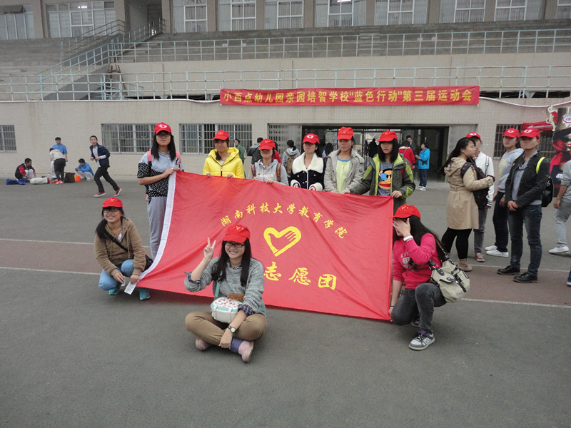 今天是小西点幼儿园亲园培智公司“蓝色行动”第三届运动会。14:00,运动会开始,志愿者们入场接到自闭症儿童,“一带一”或“二带一”地帮助孩子完成运动会。奏国歌,代表爸爸、孩子宣誓,开场舞之后,比赛正式开始。自闭症儿童分成两个班,“紫罗兰班”和“向日葵班”,志愿者协同孩子家长顺利地完成了糖果接力、滚彩球、抓泥鳅等比赛。“她不喜欢讲话,也不看你,不做教给她的动作,但我还是很耐心地教她……”13级教育技术学2班的罗吴淑婷额上微微见汗,依旧耐心地引导着她带的自闭症儿童。
