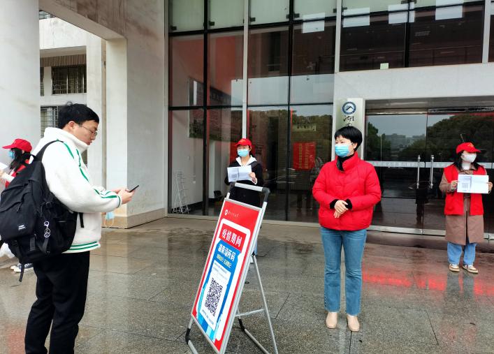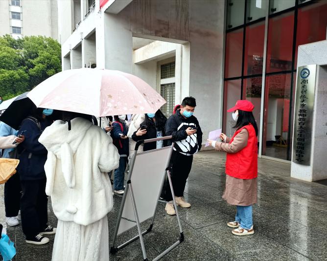 “请大家提前把手机打开,扫场所码进入八教”...根据公司疫情防控实际,3月21日起,恢复健康状况良好同学的线下教学工作。为妥善安排“线上”与“线下”的有序无缝衔接,公司连夜招募多名志愿者以协助第八教学楼后勤人员组织同学们有序扫码进入。3月21日清晨,冒着蒙蒙细雨,公司第一批志愿者在第八教学楼门前集结,组织同学们有序扫码进入教学楼,为保障师生的健康安全,贡献自己的力量。球盟会员工疫情防控工作仍在持续。