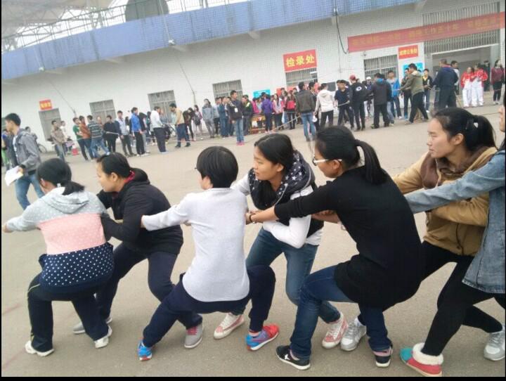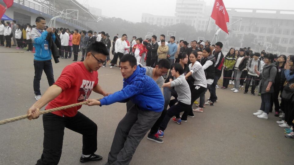 比赛还没开始时,双方队员即进入战斗状态,双手紧握麻绳,双脚用力蹬地,身体微向后倾,参赛队员齐心协力凝成了一股绳!哨声一响,口号震天,气势轩昂。球盟会的拔河队员们奋力拼搏,脸憋得通红丝毫不放松。女生们更是不甘示弱,一个个咬紧牙关,将巾帼不让须眉的精神风貌挥洒的淋漓尽致。场外的拉拉队也不甘示弱,加油声,呐喊声,助威声,直入云霄。
