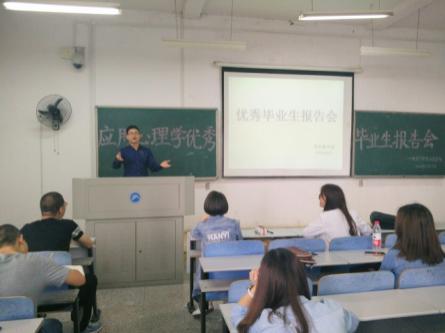 14时40 分,主持人宣布报告会正式开始,简说此次报告会共分为经验分享和答疑解惑两个环节。首先来自应用心理学一班的吴厚涛进行个人分享。他以“梦想”为主题,通过对自身励志故事的真情叙述,引出了“有梦想、有激情,让自己累起来”是个体成功的重要途径。随后,来自二班的苏维维做了简单报告,强调一个人只有明确自己想做的事,并且用心去做、用尽全力地去做才能做到尽善尽美。三班的毛晗婧及林红娟紧接着进行了各自发言。其中毛晗婧提出,老员工最重要的是能力,在清楚自己想要的是什么的情况之下,认真地去坚持,努力提升能力才能更好地去适应将来的社会生活。