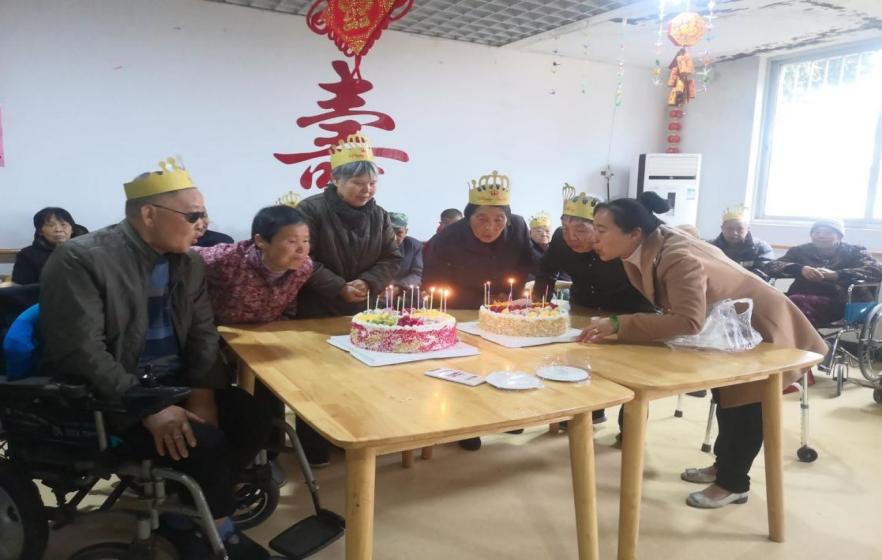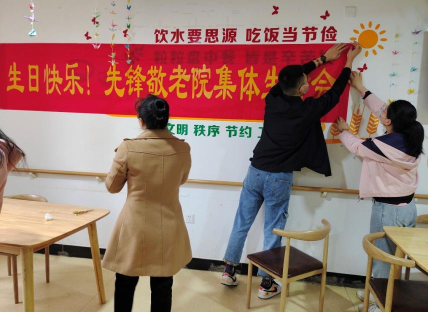 镜头转向先锋敬老院,志愿者们向爷爷奶奶们问好,介绍来意,向敬老院院负责人致意,共同商讨后进行老人的位置安排,布置活动场地,之后与计算机公司青年志愿团的伙伴们一起表演了节目,与老人一起合唱生日歌,并送上生日祝福,分发生日蛋糕。