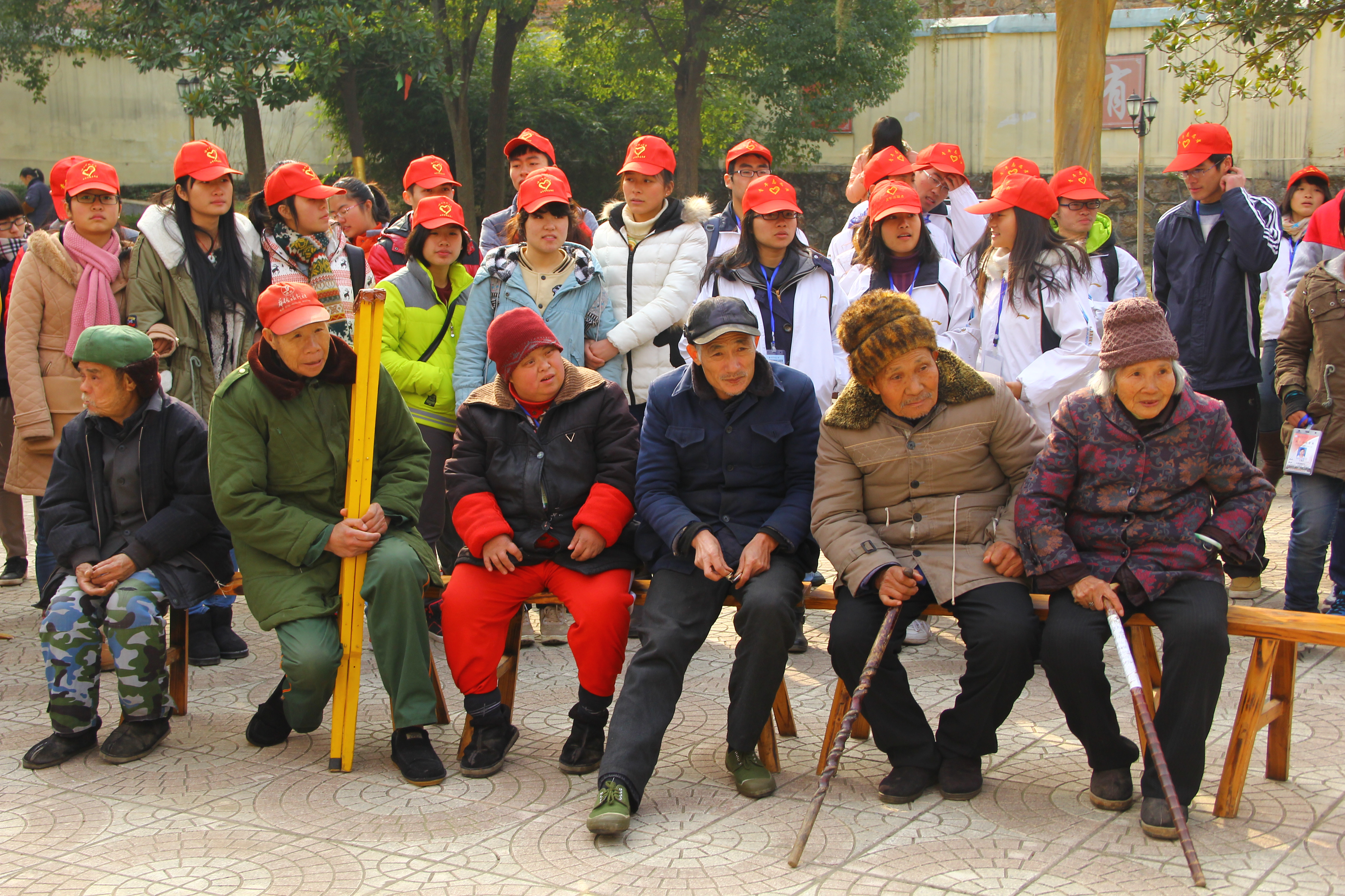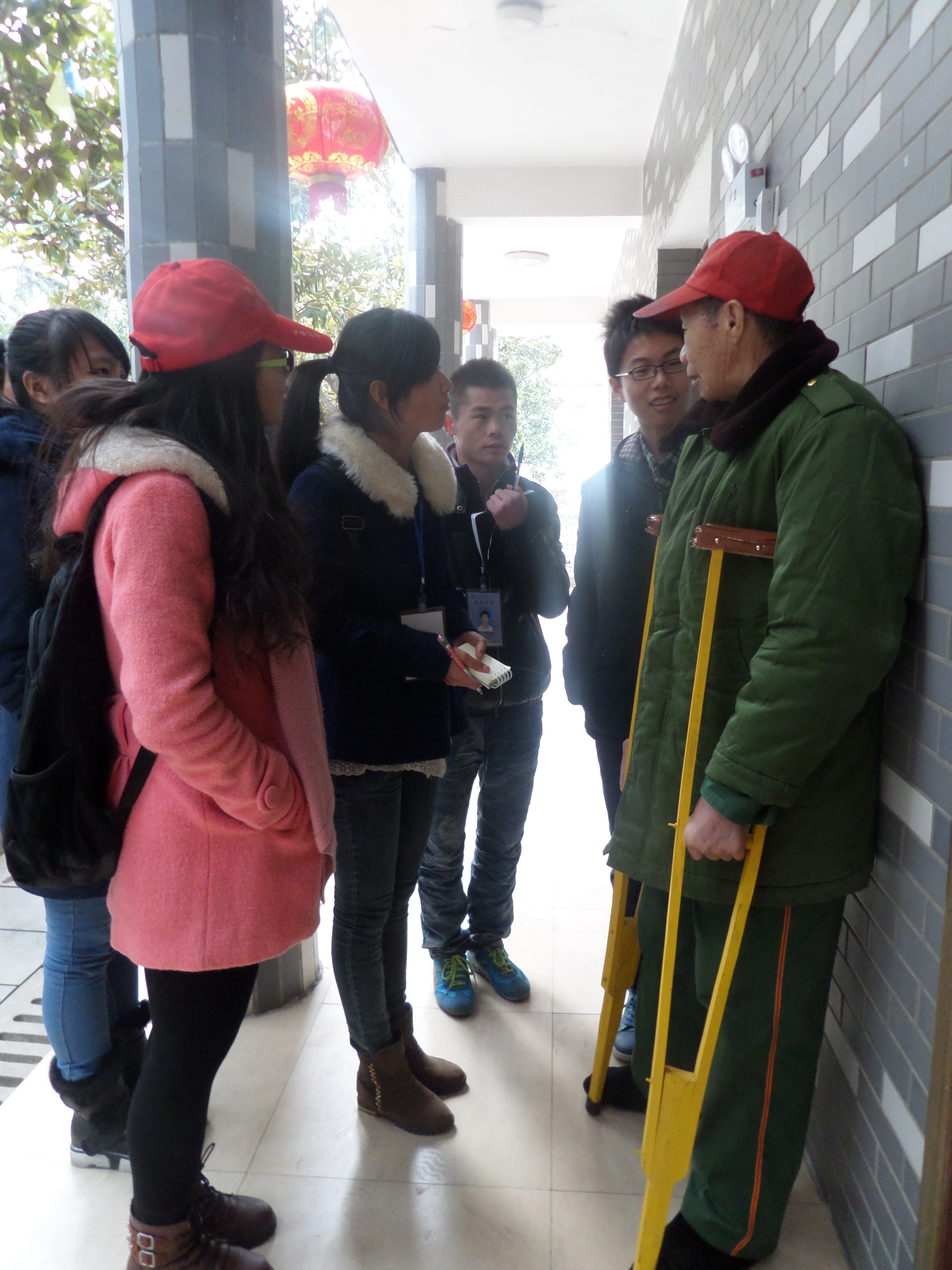 志愿者随后就分头与老人唠家常,与国同生的杨铁罗老人拄着双拐,对围住他的志愿者表达谢意:“今天真的很开心。”当13级教育学2班的杨科问老人希望志愿者做些什么时,“你们来就好了”,老人的回答是对志愿者最大的鼓励。志愿者把采买带来的大量食品分发给老人,一位老人把分到的香蕉塞到志愿者手里,摸着志愿者的手说:“孩子,你穿太少了,会感冒的。”