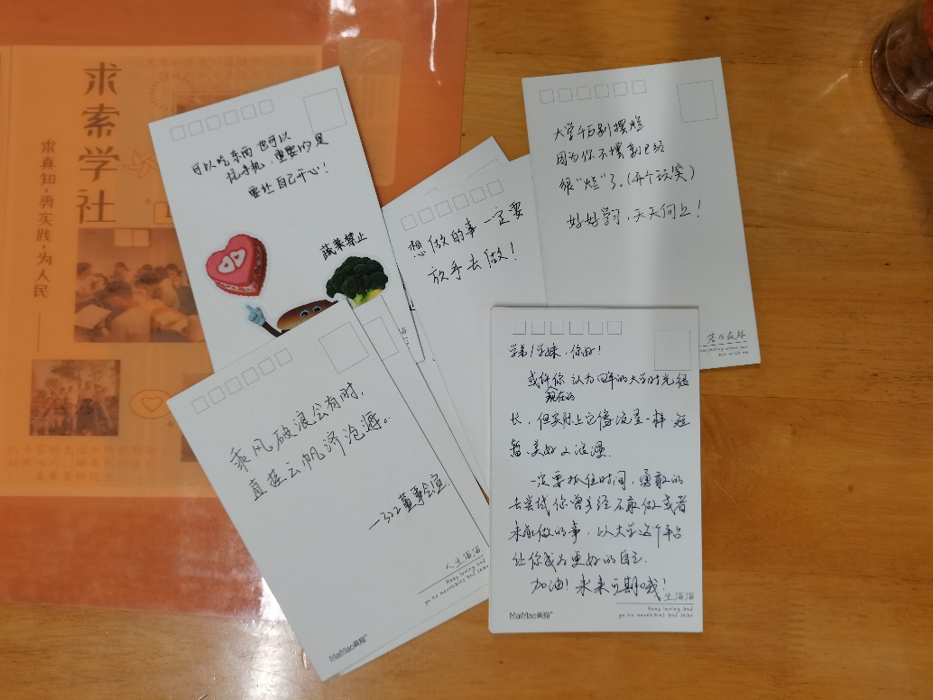 为促进毕业生与学弟学妹们的经验交流, 6月7号,员工资源部的成员们来到了毕业生寝室,邀请各位学长学姐写下“爱的寄语”。通过寄语卡,学长学姐向同学们传授了学习、考研、应聘等多方面经验,同时表达了对学弟学妹们的真诚祝福。一张张爱心卡片上是学长学姐们在这四年间的亲身经历与感悟,他们将自己宝贵的经验倾囊相授,为同学们解答疑惑,点明了前进方向。