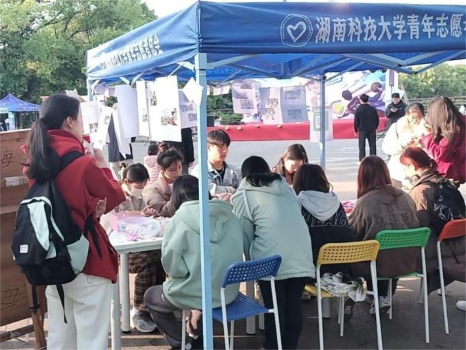天空澄碧,和风送暖,志愿者们积极行动,一起搭帐篷、摆桌椅、张贴宣传海报并为参与人员准备小礼物。